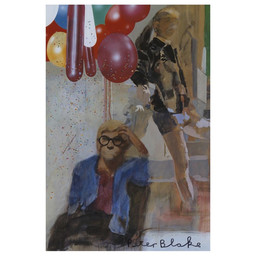 Color glossy 8 x 12 photo of Peter Blake's 1965 painting 'Portrait of David Hockney in a Hollywood Spanish Interior,' signed in black felt tip by Blake. In fine condition.