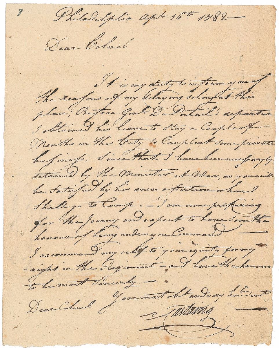 French volunteer in the American Revolution who served as aide-de-camp to General Louis Duportail; he saw action at Valley Ford and was taken prisoner at Charleston in 1780. LS signed “P. Castaing,” one page, 6.75 x 8.5, April 16, 1782. Letter to a colonel (quite possibly Colonel Henry Jackson). In part: “It is my duty to inform you of the reason of my delaying so long at this place; before General DuPortail's departure I obtained his leave to stay a couple of months in this city to complete some private business; since that I have been necessarily detained by the Minister of War as you will be satisfied by his own assertion when I shall go to camp. I am now preparing for the journey and expect to have soon the honor of being under your command. I recommend myself to your equity for my right in the regiment.” In fine condition. Here Castaing refers to the French minister of war, Comte De Vergennes, who consented to the American peace negotiations with Great Britain which came to a preliminary agreement in 1782.