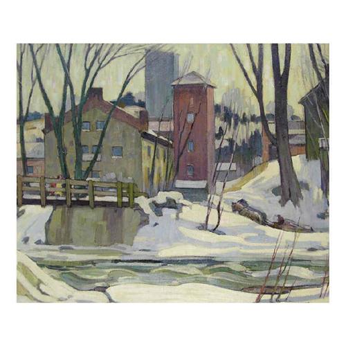 [Canadian OSA, RCA 1882-1965] MILL TOWN; 1949 Oil on canvas 30 x 36 in. Signed, titled & dated.