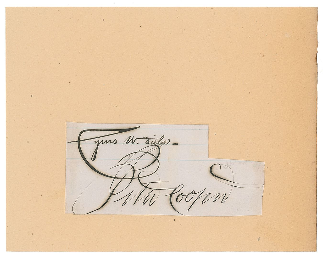 Ink signatures, "Cyrus W. Field" and "Peter Cooper," on a white 4.5 x 2 slip, trimmed and affixed to a larger album page. In very good to fine condition, with light show-through along the edges from mounting on the back. Cooper was an industrialist, inventor, and politician (1791–1883) who designed the first steam locomotive built in the United States; Field was an industrialist (1819–1892) who financed the first permanently operational transatlantic telegraph cable.