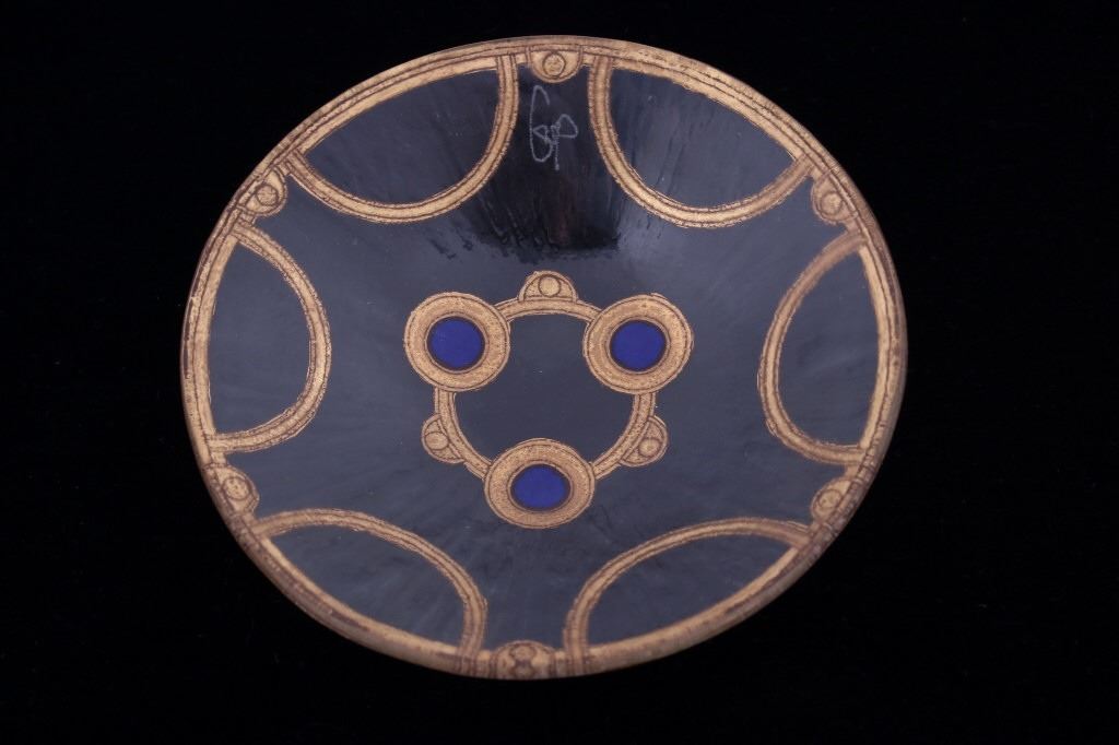 For your consideration is a Peter Crisp 22K Lapis Lazuli and Jade glass bowl and charger. Peter Crisp has been working since 1978 with glass molding techniques using the fused and slumped method. Having studied at Sydney College of the Arts, Crisp has exhibited his work in more than 60 exhibitions both in Australia and abroad. His work relates itself to ancient Egyptian glass working practices by using modern molding materials and equipment. Crisp produces three highly individual designs which are decorated by hand with 22 carat gold. To take advantage of its greater strength, Skoda type lass is used. Peter Crisp is well known for his tableware decorated with screen-printed patterns, 22ct gold and semi-precious gems. This little shallow bowl with the royal bluebell design are the simplest of his works. The glass beads have grown into jeweled hemispheres of jade and lapis lazuli embedded in the glass. Each piece of work created is signed 'Crisp'. Crisp glass is an investment in fine art and is chosen by discerning collectors around the world for its quality and creative craftsmanship. The bowl measures 4 5/8” in diameter and the plate measures 4 7/8” in diameter.