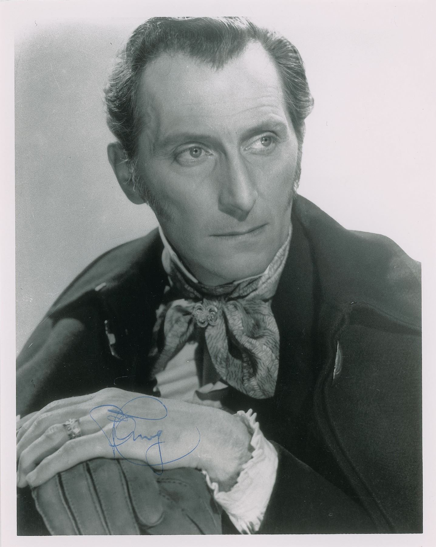 Glossy 8 x 10 photo of Cushing in costume, signed in fountain pen. In fine condition. Accompanied by a transmittal slip dated 1990.