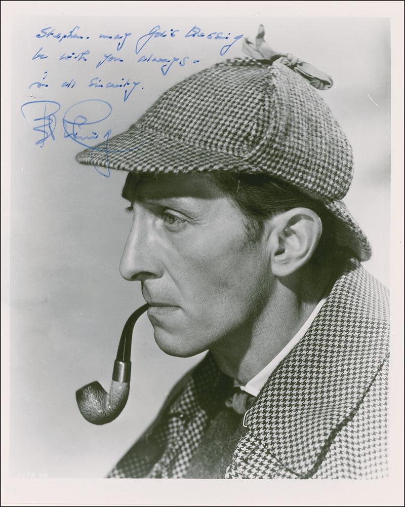 Glossy 8 x 10 photo of Cushing as Sherlock Holmes, signed and inscribed in blue ink “Stephen, may God’s blessing be with you always–In all sincerity, Peter Cushing.” In fine condition, with a couple small surface dings.