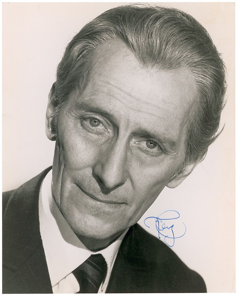 Glossy 8 x 10 photo of the distinguished British actor, signed in blue fountain pen. In fine condition, with mild soiling to the upper right corner.