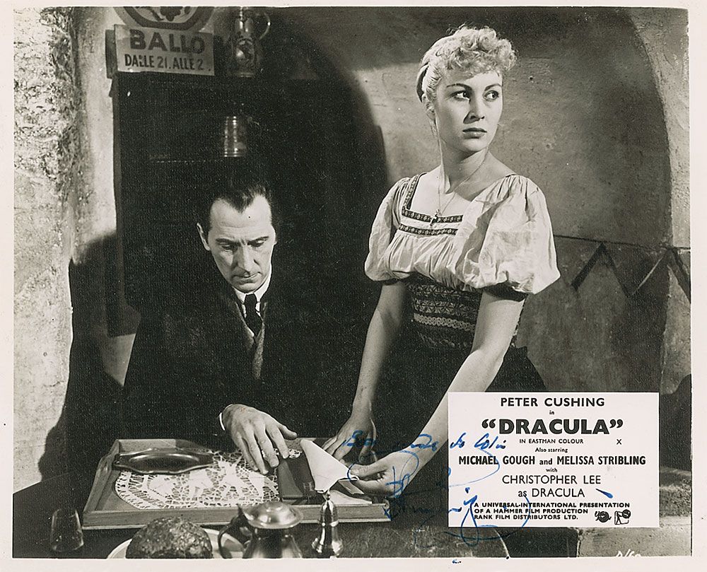 Matte-finish 9.5 x 7.75 photo of Cushing as he appeared in Dracula, signed and inscribed in fountain pen, “Best wishes to Colin, Peter Cushing.” In fine condition, with some light contrast to signature and inscription.