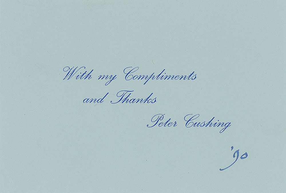 Glossy 10 x 8 photo of Cushing using an old telephone, signed and inscribed in blue ink, “Matthew, May God’s blessing be with you always. In all sincerity, Peter Cushing.” A few surface impressions to the right side and some irregularities to emulsion, otherwise fine condition. Accompanied by Cushing’s printed transmittal slip.