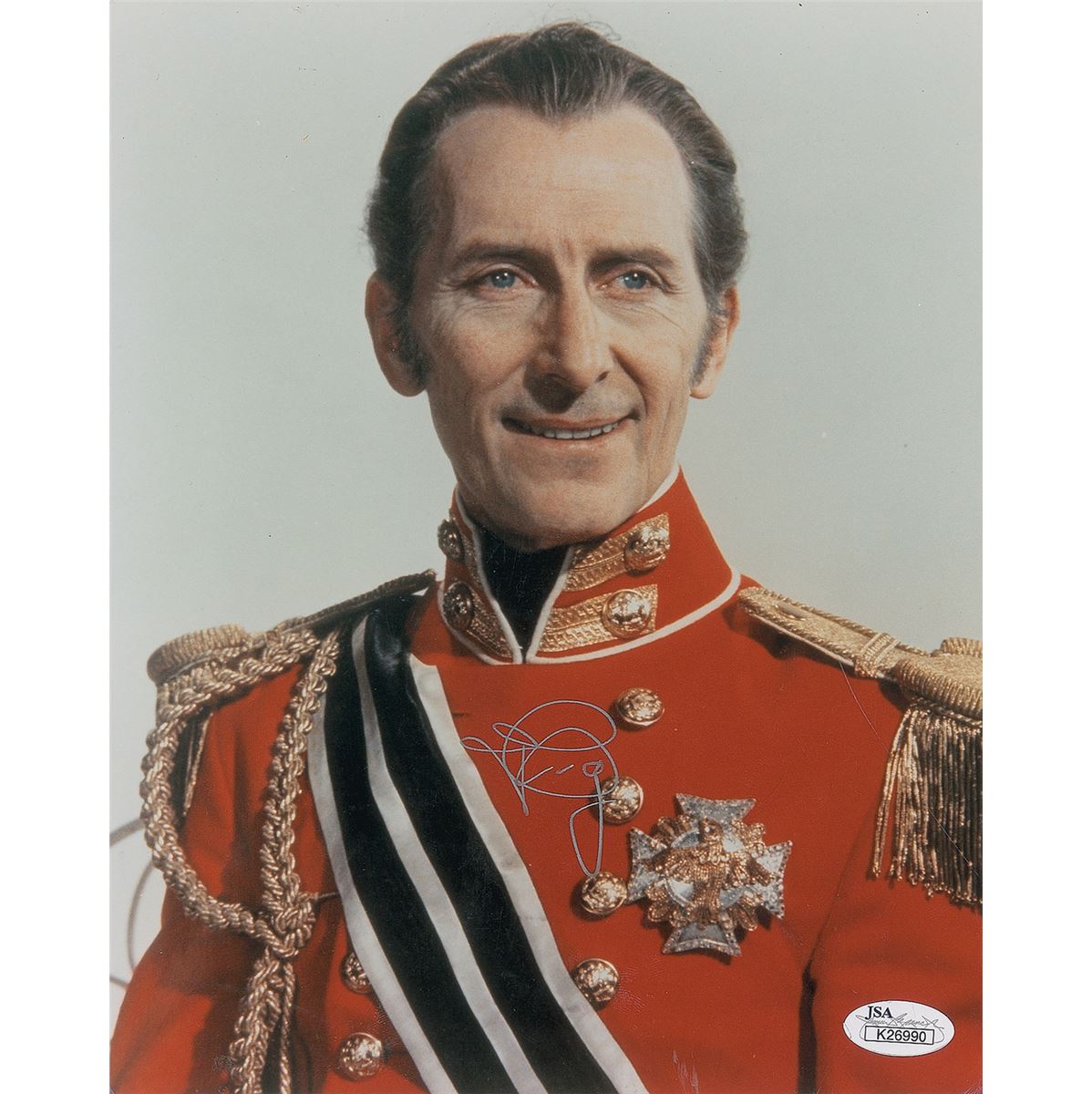Color glossy 8 x 10 head–and–shoulders portrait of Cushing from the 1970 film The Vampire Lovers, signed in silver ink, “P. Cushing.” In fine condition, with some soiling, scattered surface impressions, and a JSA label affixed to lower right corner. Accompanied by a certificate of authenticity from JSA.