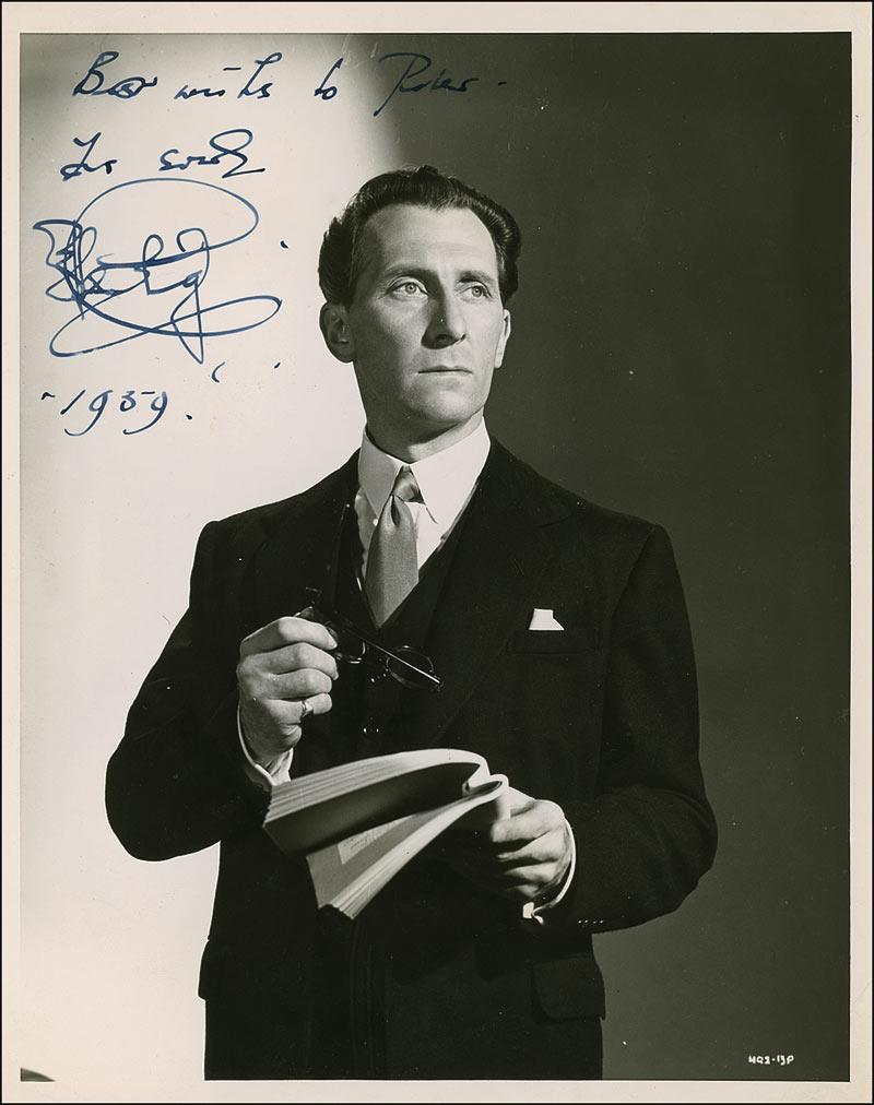 Vintage glossy 8 x 10 photo of the distinguished-looking actor reading a script, signed and inscribed in fountain pen “Best wishes to Peter, Yours sincerely, Peter Cushing 1959.” Scattered light creasing and surface dings, otherwise fine condition.