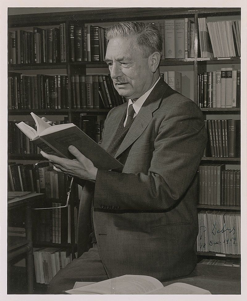 Nobel Prize winner for Chemistry in 1936 for developing the technique of X-ray crystallography. Vintage glossy 8 x 10 photo of Debye browsing through a book, signed in fountain pen, “P. Debye 18 Dec. 1959.” In fine condition.