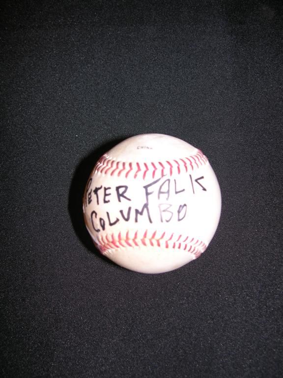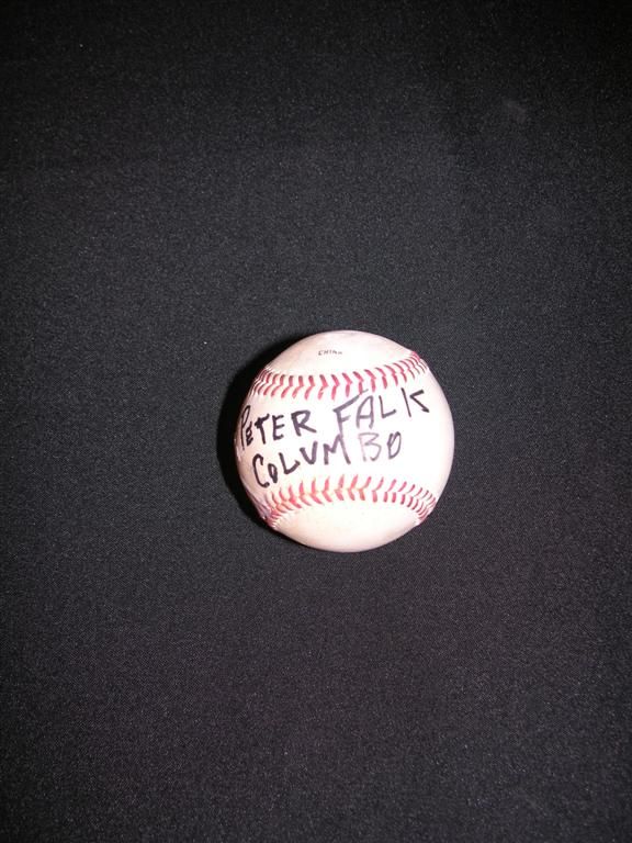 Golden League baseball signed in black ink by actor Peter Falk, who has also inscribed the name of his famous detective character, Columbo. The signature appears on the ball's "sweet spot". A certificate of authenticity is included.