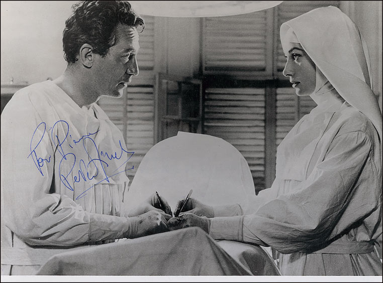 Vintage 9.25 x 7 photo of Finch across from Audrey Hepburn in The Nun’s Story, signed and inscribed in-person in blue ink “For Pierre, Peter Finch.” In fine condition.