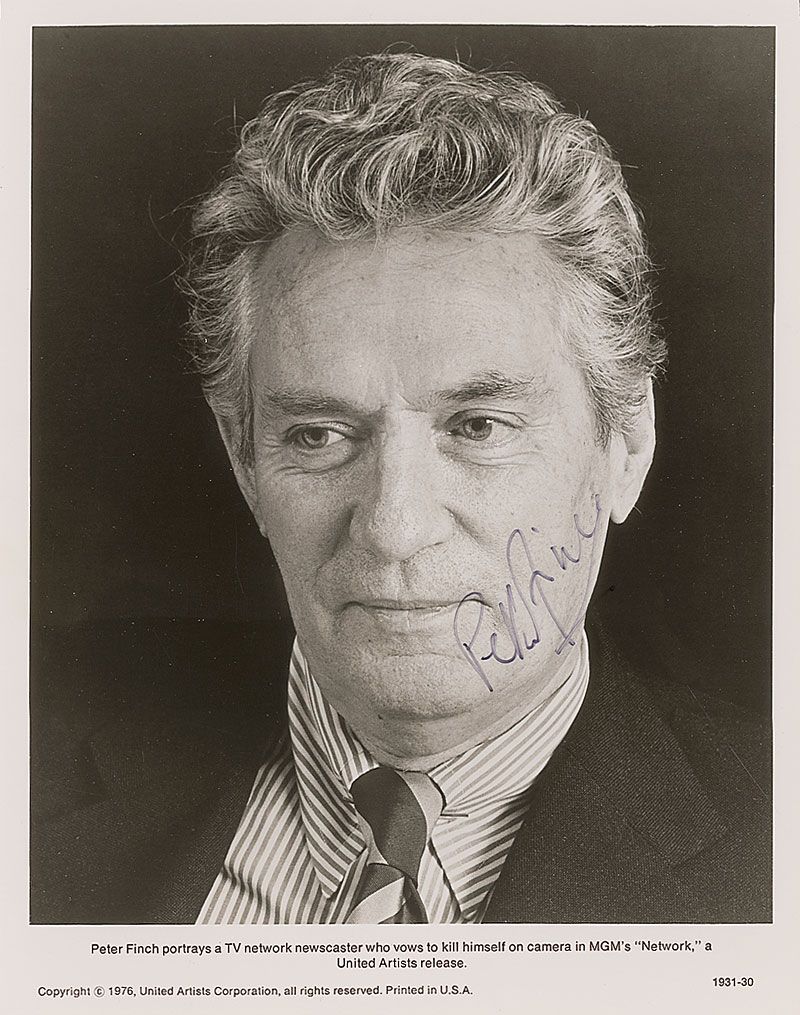 Posthumous winner of the Academy Award for Best Actor (1916–1977) for his unforgettable role as crazed newscaster Howard Beale in Network. Glossy 8 x 10 United Artists publicity photo for Network, signed in black felt tip. In fine condition, with some scattered light surface marks.