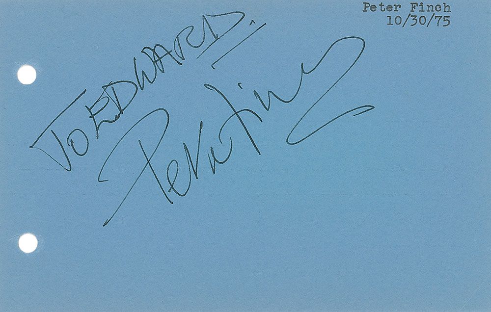 Ink signature and inscription, “To Edward, Peter Finch,” on a blue 6 x 4 album page bearing a typed collector’s notation dated October 30, 1975. In fine condition, with punch holes to left border.
