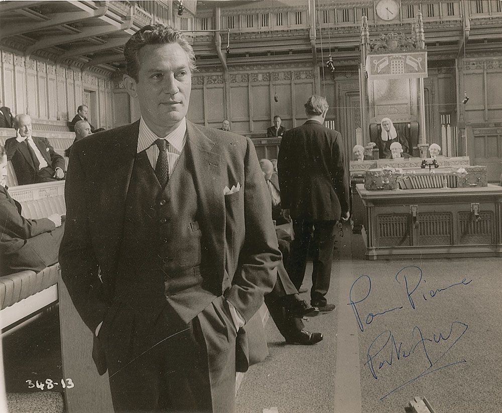 Glossy 10 x 8 photo of Finch in the 1961 film No Love for Johnnie, signed and inscribed in person in fountain pen, “Pour Pierre, Peter Finch.” In fine condition.