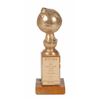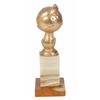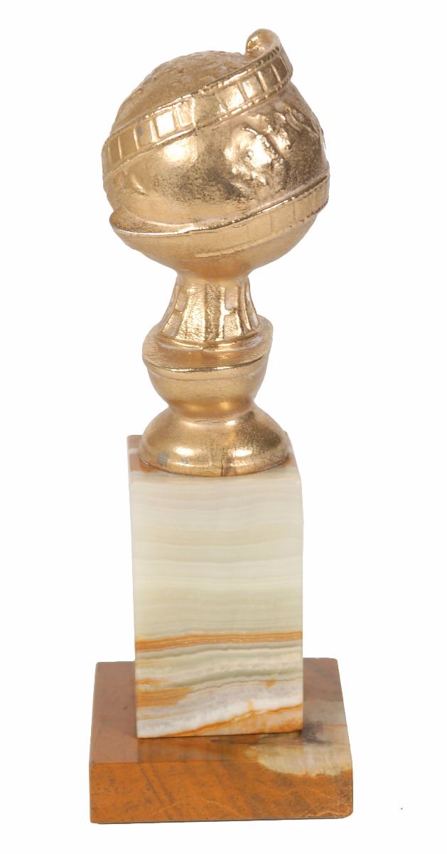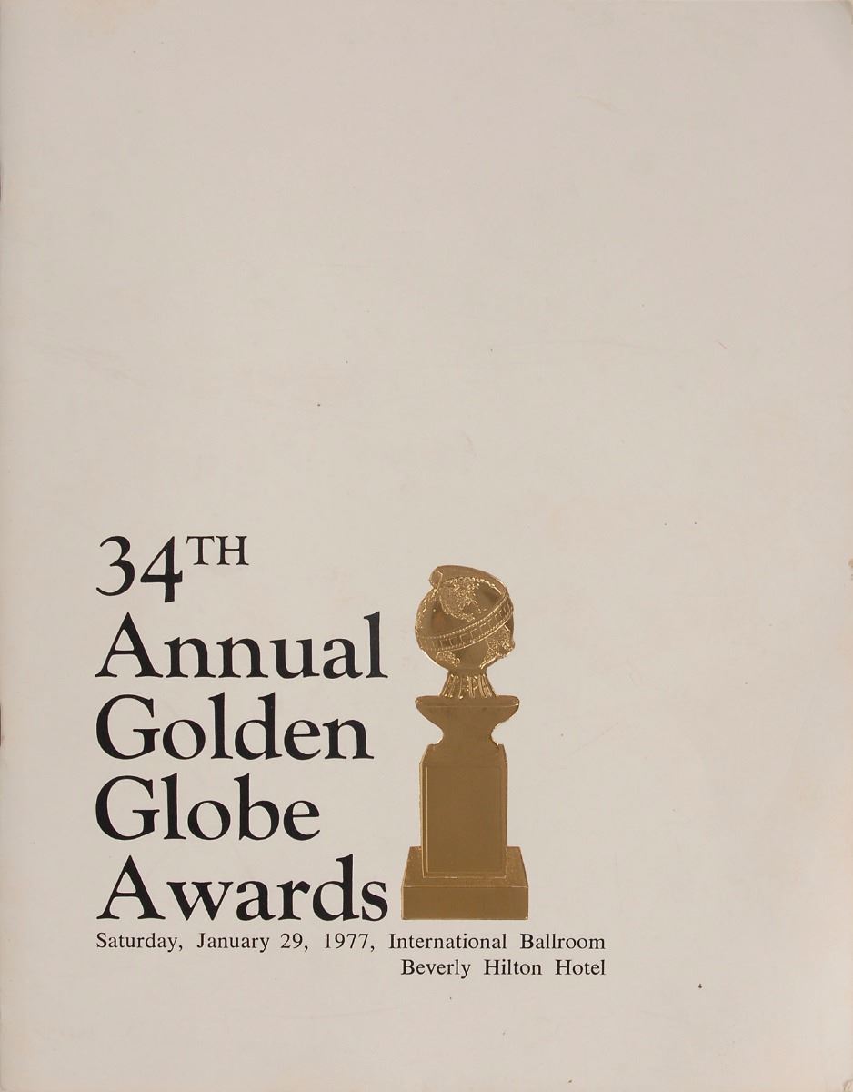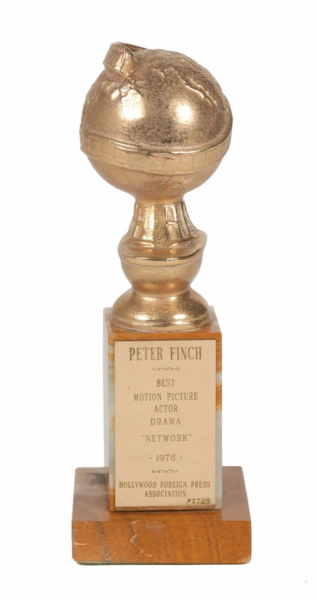 Iconic original Golden Globe posthumously awarded to Peter Finch for his role as Howard Beale in the 1976 film Network. The award trophy measures approximately 9? tall with a base of 3 x 3, weighs 2.85 pounds, and bears a neatly engraved plaque on the front of the marble stand, “Peter Finch, Best Motion Picture Actor, Drama, ‘Network,’ 1976, Hollywood Foreign Press Association, #7728.” In very good to fine condition, with a few tiny cracks to the metal globe and a ‘rattle,’ as if something has become detached inside of the globe; these are merely superficial flaws, and the award is structurally sound. Accompanied by an original program for the 34th Annual Golden Globe Awards, held on January 29, 1977.