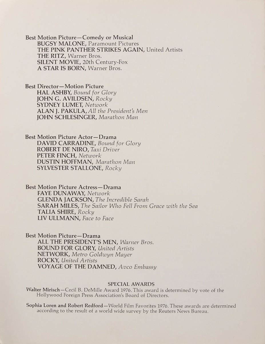 Written by Paddy Chayefsky and directed by Sidney Lumet, Network was Finch’s final feature film and one of the greatest commercial and critical successes of his prolific career. Sadly, he passed away on January 14, 1977, before he was able to reap the fruits of his labor—in addition to winning this Golden Globe, Finch was also awarded the first-ever posthumous Oscar. Network has continued to earn acclaim and accolades over the years, and since 2000 has been selected for preservation in the United States National Film Registry by the Library of Congress, inducted into the Producers Guild of America Hall of Fame, and named one of the greatest one hundred American films by the American Film Institute.