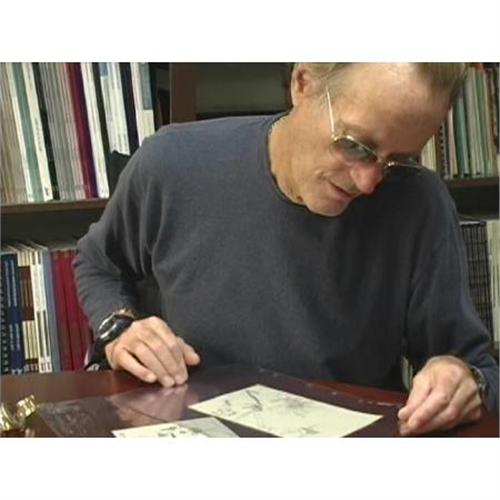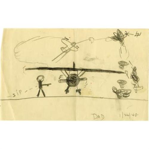 <B>Peter Fonda's Picture Drawn for his Father at Age 7.</B></I> A 5" x 8" original sketch by seven-year-old Peter Fonda, dated January 24, 1948, after his father had returned from his tour of duty in the Pacific and when he was in rehearsals in New York for the play <I>Mr. Roberts.</B></I> The sketch is a combat scene, showing planes, some falling from the sky. Peter has added a swastika to the sketch with an arrow pointing to one of the planes (although his Dad had fought the Japanese). Perhaps most interestingly, Peter had penciled "Dad" at the bottom of the picture, indicating this was created as a gift for his father. In Very Good condition.{br}{br}{a href=”/common/images/media/PeterFondaLot22248-22252_320.wmv”}<B>See and hear Peter Fonda discussing this item!</B></I>{/a}{br}{br}<BR><BR><b>Shipping:</b> Flat Material, Small (<a target="_blank" href="http://www.heritageauctions.com/common/shipping.php">view shipping information</a>)