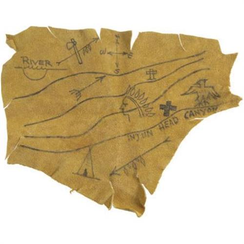 <B>Peter Fonda's Prop Map and Original Press Photos from</B></I> <B><I>Wanda Nevada.</B></I></B></I> This "treasure map" drawn on an approximately 14" x 12.5" piece of leather, was used as a prop in the 1979 comedy starring Peter Fonda as a drifter who wins the title character (played by Brooke Shields) in a card game and subsequently takes her prospecting in the Grand Canyon. The movie featured a brief cameo by Henry Fonda, making it the only appearance of the father-and-son actors. Included with it is a 4" x 5" color slide, and one b&w 11" x 14" and 36 b&w 8" x 10" promo photos from the production. The items are in overall Excellent condition with some mild wear and corner creasing to the larger photo. <I>From the Peter Fonda Archive.</B></I><BR><BR><b>Shipping:</b> Flat Material, Small (<a target="_blank" href="http://www.heritageauctions.com/common/shipping.php">view shipping information</a>)