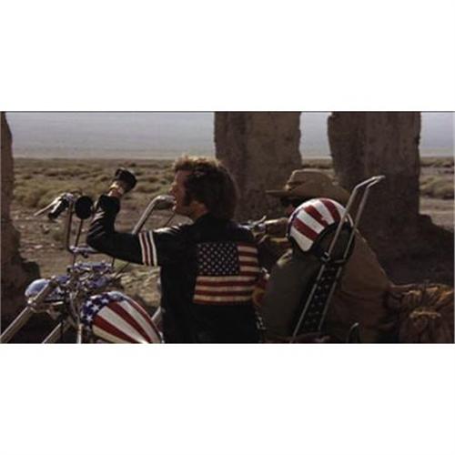 <B>Peter Fonda's American Flag Patch from His "Easy Rider" Jacket.</B></I> A surprise mega-hit during its 1969 theatrical run, <I>Easy Rider</B></I> is one of those rare movies that changed the way motion pictures are made and defined a generation in the process. Peter Fonda and Dennis Hopper co-star as "Wyatt" (aka "Captain America") and "Billy," respectively, hippie motorcyclists who try to obtain their own version of the American Dream via a drug deal. Their quest takes the form of a road trip across the Southern and Southwestern United States (stunningly captured on film by late cinematographer László Kovács), where they encounter the best and worst of a nation in turmoil, and ultimately find only disillusionment and death. As the tagline so eloquently put it, "They went searching for the American Dream and couldn't find it anywhere."<BR><BR>It's a story that is as provocative and relevant now as it was then. The impact of <I>Easy Rider,</B></I> along with <I>Bonnie and Clyde,</B></I> <I>The Graduate,</B></I> and <I>Midnight Cowboy,</B></I> helped jumpstart the "Hollywood Renaissance" of the 1970s, a period that saw studios investing more and more into smaller -- and often riskier -- movies by directors with a personal vision, projects such as <I>American Graffiti,</B></I> <I>Mean Streets,</B></I> <I>The Conversation,</B></I> and <I>One Flew Over the Cuckoo's Nest.</B></I> Its soundtrack set an early standard for the use of pop and rock music in motion pictures at a time when recycling songs was unheard of; now multi-artist pop soundtracks are par for the course and often a major source of revenue.<BR><BR>This is the original, one-and-only American flag patch worn on the back of Wyatt's motorcycle jacket, featured prominently throughout the movie and also its classic poster. Peter kept the jacket after production wrapped, and wore it until it wore out. He saved the patch, however, framed it, and has held onto it for almost 40 years. The patch measures 14.5" x 11" and is in Very Good to Fine condition with moderate to heavy overall fading and toning from age, and overall moderate wear. Some areas on the upper right quadrant and the blue field have deteriorated and worn away enough to reveal the vinyl backing underneath; said backing is visible on the reverse and exhibits uniform glue residue. The flag has been framed in a double-sided glass display that measures 21.25" x 17.25". A truly unique item from an American classic that continues to inspire.{br}{br}{a href=”/common/images/media/PeterFondaLot22270_320.wmv”}<B>See and hear Peter Fonda discussing this item!</B></I>{/a}{br}{br}<BR><BR><b>Shipping:</b> Framed - with Glass, Small (<a target="_blank" href="http://www.heritageauctions.com/common/shipping.php">view shipping information</a>)
