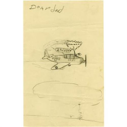 <B>Peter Fonda's Hand-Drawn Picture, Age 7.</B></I> Peter Fonda had a father who was not only a movie star, but a war hero, having received the Bronze Star during his World War II service in the Pacific. Here's a pencil-drawn 5" x 8" scene by Peter of a fighter plane above a cloud, and addressed "Dear Dad." Although undated, this is probably one of the pictures Peter drew for his father when Henry Fonda was preparing to open in <I>Mr. Roberts</B></I> on Broadway in February 1948. In Excellent condition.{br}{br}{a href=”/common/images/media/PeterFondaLot22248-22252_320.wmv”}<B>See and hear Peter Fonda discussing this item!</B></I>{/a}{br}{br}<BR><BR><b>Shipping:</b> Flat Material, Small (<a target="_blank" href="http://www.heritageauctions.com/common/shipping.php">view shipping information</a>)