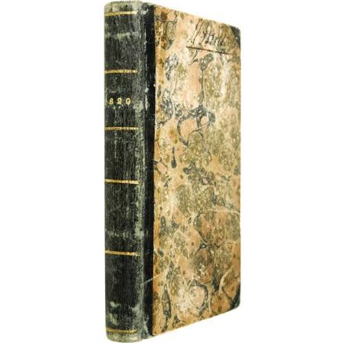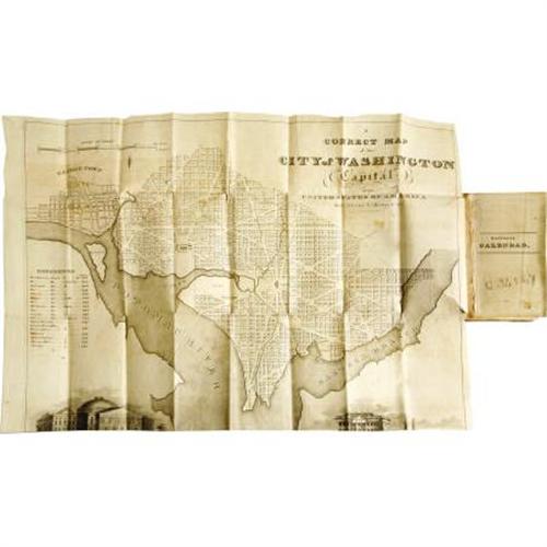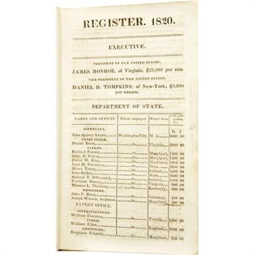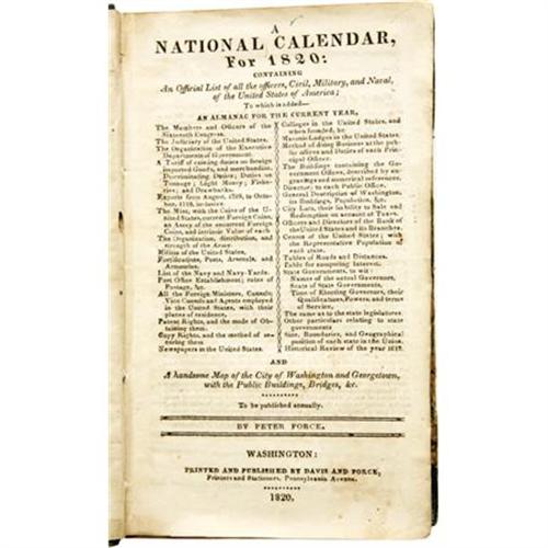 <B>Peter Force:<I> A National Calendar, for 1820: Containing an Official List of all the officers, Civil, Military, and Naval, of the United States of America;</B></I></B></I><I> To Which is added an Almanac for the Current Year and A handsome Map of the City of Washington and Georgetown, with the Public Buildings, Bridges, &c.</B></I> (Washington: Davis and Force, 1820), 228 pages, with 22” x 17” fold out map of Washington engraved by William I. Stone bound in front, the volume is illustrated with engravings of the “President's House, State, Treasury, War and Navy Departments”, original marbled boards, leather spine with gilt “1820”, 12mo (4” x 6.5”), light crazing to leather spine, shelf wear to boards especially at the edges and corners, areas of staining on the pastedowns, light toning to pages, small marginal tears, period marginalia, else very good. The personal copy of Captain Thomas Brown, commander of the United States Navy ship <I>Peacock,</B></I> a veteran of the War of 1812. Brown has made several emendations and corrections to the listing of naval officers and their assignments of which he was no doubt familiar. Rare and informative, this directory comprises a who's who of the federal government circa 1820 with engraved illustrations of key government buildings including some floorplans. William I. Stone's engraving of the “President's House” on the fold out map is thought to be the first known image of the structure after being burned by the British in 1814. This same year Stone was commissioned by John Quincy Adams to reproduce a facsimile of the Declaration of Independence. The Stone copies, of which 31 out of the original 201 produced are known to exist are the most highly sought after replicas of the Declaration. Includes a ten-page description of “Washington City” with demographic data and real estate information. Records indicate that no copies of this work have been offered at auction since the early 1970s. <BR><BR><b>Shipping:</b> Books & Catalogs (<a target="_blank" href="http://www.heritageauctions.com/common/shipping.php">view shipping information</a>)