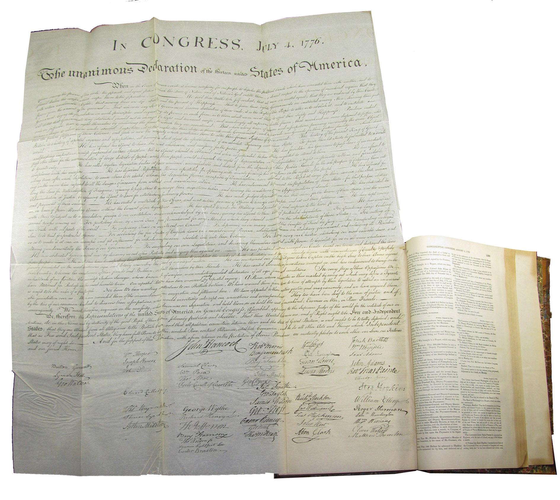 Extremely rare fold-out Force print of William J. Stone’s official engraving of the Declaration of Independence from “American Archives: A Collection of Authentick Records, State Papers, Debates, and Letters and Other Notices of Publick Affairs, the Whole Forming a Documentary History of the Origin and Progress of the North American Colonies; of the Causes and Accomplishment of the American Revolution; and of the Constitution of Government for the United States, to the Final Ratification Thereof, Volume I of the Fifth Series. Edited by Peter Force. Washington, D.C.: M. St. Clair Clarke and Peter Force: 1848. Folio volume runs 951pp. Most extant copies of this volume are missing the highly sought after fold-out rice paper Declaration of Independence. When Congress commissioned Peter Force to compile the nine-volume, 15,500pp. “American Archives'' series documenting the nation’s history in 1843, it was determined that a copy of the Declaration would be included in the volume covering 1776. Twenty-three years earlier, as the original document was rapidly deteriorating, Secretary of State John Quincy Adams had authorized engraver William J. Stone to create a copperplate of the Declaration via painstaking wet-ink transfer. It took Stone three years to create a plate with absolute fidelity to the original, although the process caused additional deterioration to the original document, now exhibited in the Capitol Rotunda in Washington, D.C. Stone printed 201 copies on vellum. He kept one copy for himself, now residing in the Smithsonian, and the other copies were distributed to Thomas Jefferson, President James Monroe, members of Congress, surviving original Signers, various colleges and universities, and others. Of the original 201 copies, only 31 examples are currently known to exist, 19 of which are permanently housed in museums. The remaining dozen vellum examples are rarely offered for sale. The “American Archives'' copies were made from Stone’s plate, now housed in the National Archives. Congress authorized up to 1,500 copies of the book to be printed, but subscriptions fell far short of that number. The actual number of copies of the book printed is unknown, with estimates ranging at around 500 copies. Fewer than half are believed to have survived, in varying states of preservation, most missing the Declaration. This is an extremely rare opportunity to find the book with the Declaration still intact and in such pristine condition. The fold-out document measures 26'' x 29'' and is stamped at lower left, “W.J. Stone S.C. Washn.'' Document shows minor ink transfer from being folded in book. Overall excellent condition.