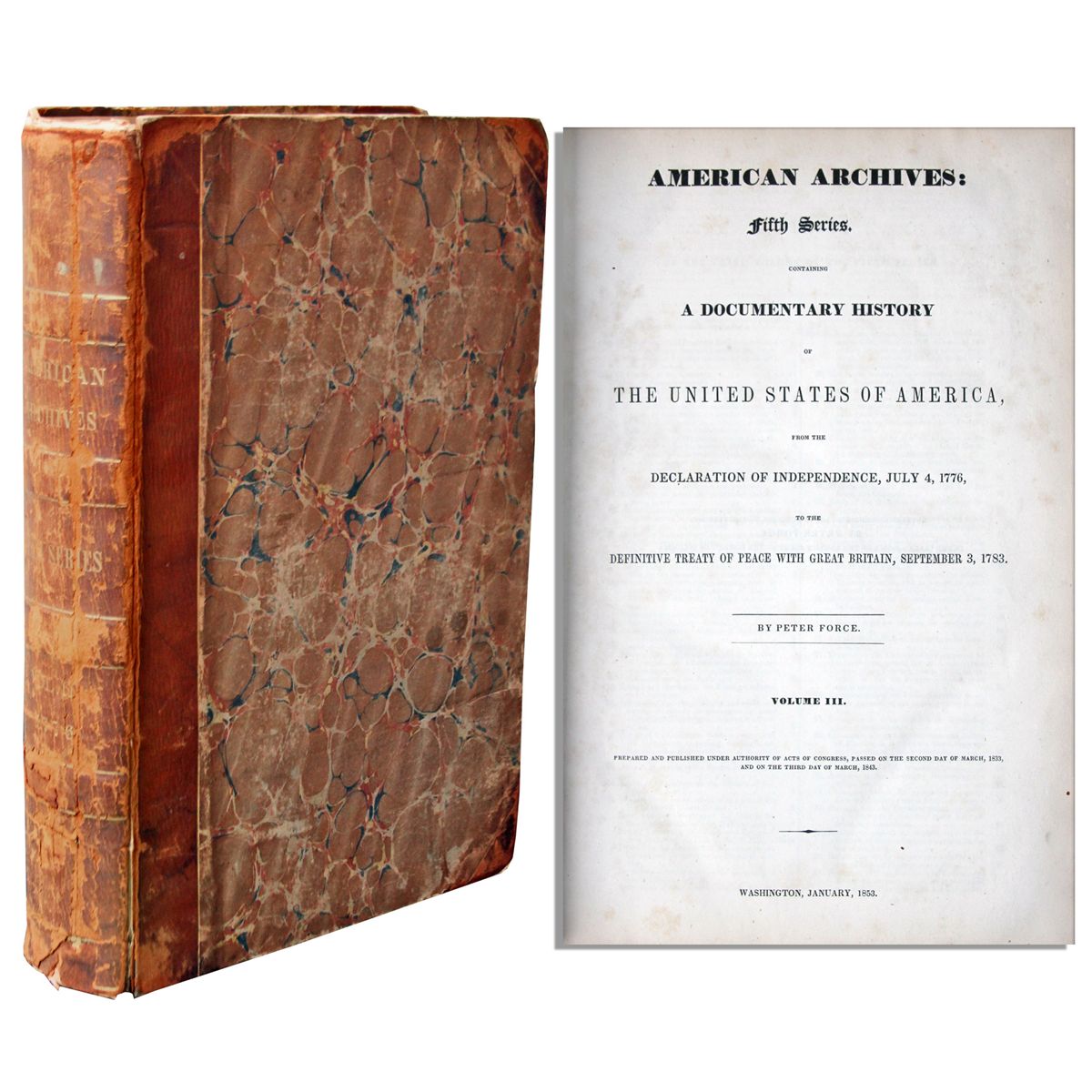''American Archives: Fifth Series. Containing a Documentary History of The United States of America from the Declaration of Independence, July 4, 1776 to the Definitive Treaty of Peace With Great Britain, September 3, 1783'' by Peter Force. Volume III. Washington: January, 1853. Contents include numerous period letters, speeches and resolutions from the Continental Congress documenting the American Revolution as it unfolded. Peter Force, a nineteenth century mayor of Washington, was better known as a collector of historical documents on the Revolutionary War; Congress purchased his collection in 1867 and used it to establish the Library of Congress. 1891pp. measures 9.25'' x 14''. Bumping to board corners with missing leather. Leather upon backstrip is also flaking with missing fragments but gilt title is intact. Back hinge exposes binding. Good to very good condition. An important reference book on the American Revolution.