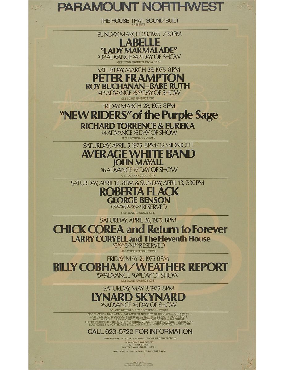 Original 13.25 x 22 color poster for upcoming 1975 shows at the Paramount Northwest in Seattle, Washington. Among the acts listed are Peter Frampton, Lynyrd Skynyrd, the Average White Band, John Mayall, and the ‘New Riders’ of the Purple Sage, all set against a light image of the logo for the Average White Band. In fine condition, with multiple tack holes to corners, and a couple staple holes to edges.