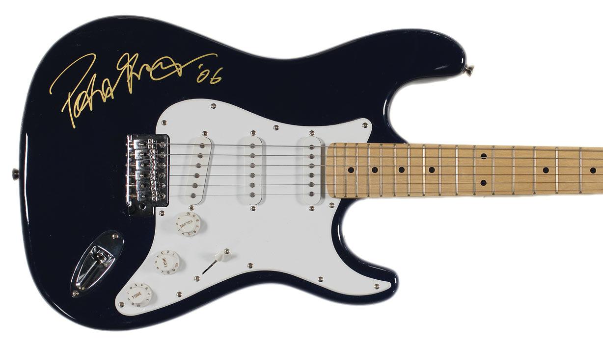 Blue-bodied California ‘stratocaster-style’ electric guitar, signed on the body in gold ink, “Peter Frampton ‘06.” In fine condition. Accompanied by a photo taken at time of signing. Oversized.