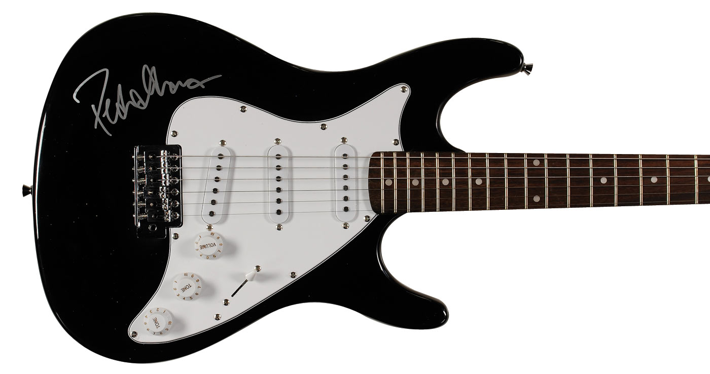 Black-bodied BG Guitars Assassin ‘stratocaster-style’ electric guitar, signed on the body in silver ink. In fine condition. Oversized.