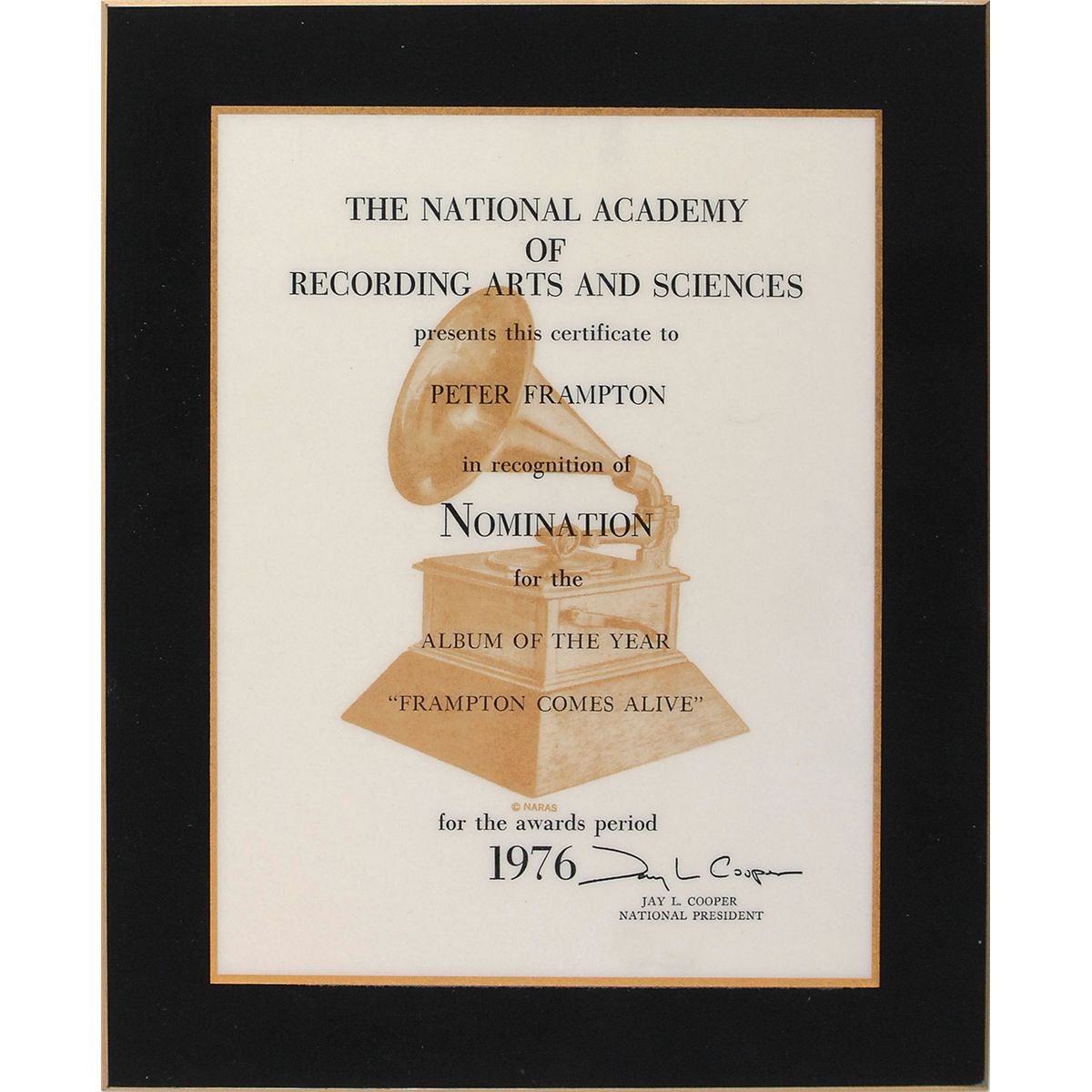 Nomination plaque, 8.5 x 10.75, presented to Frampton by the National Academy of Recording Arts and Sciences for Frampton Comes Alive as a nominee for the 1976 album of the year. In fine condition.
