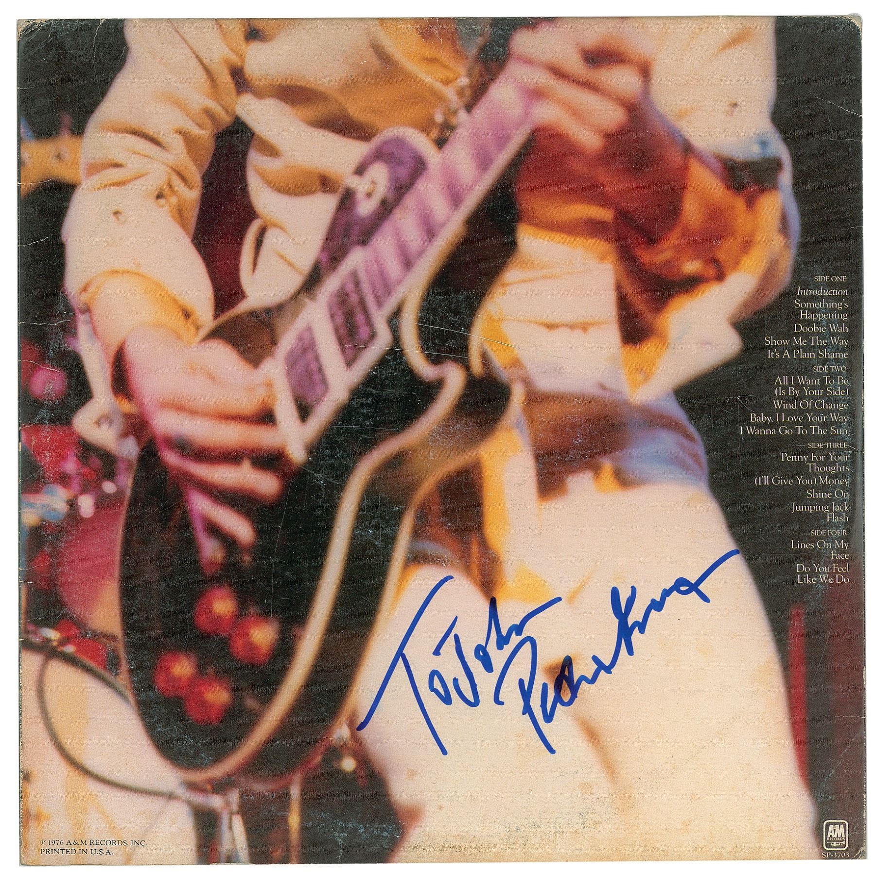 Frampton Comes Alive! album signed and inscribed on the back cover in blue felt tip, "To John, Peter Frampton." In very good to fine condition, with light scuffing, and some sticker residue to the front. The record is included.