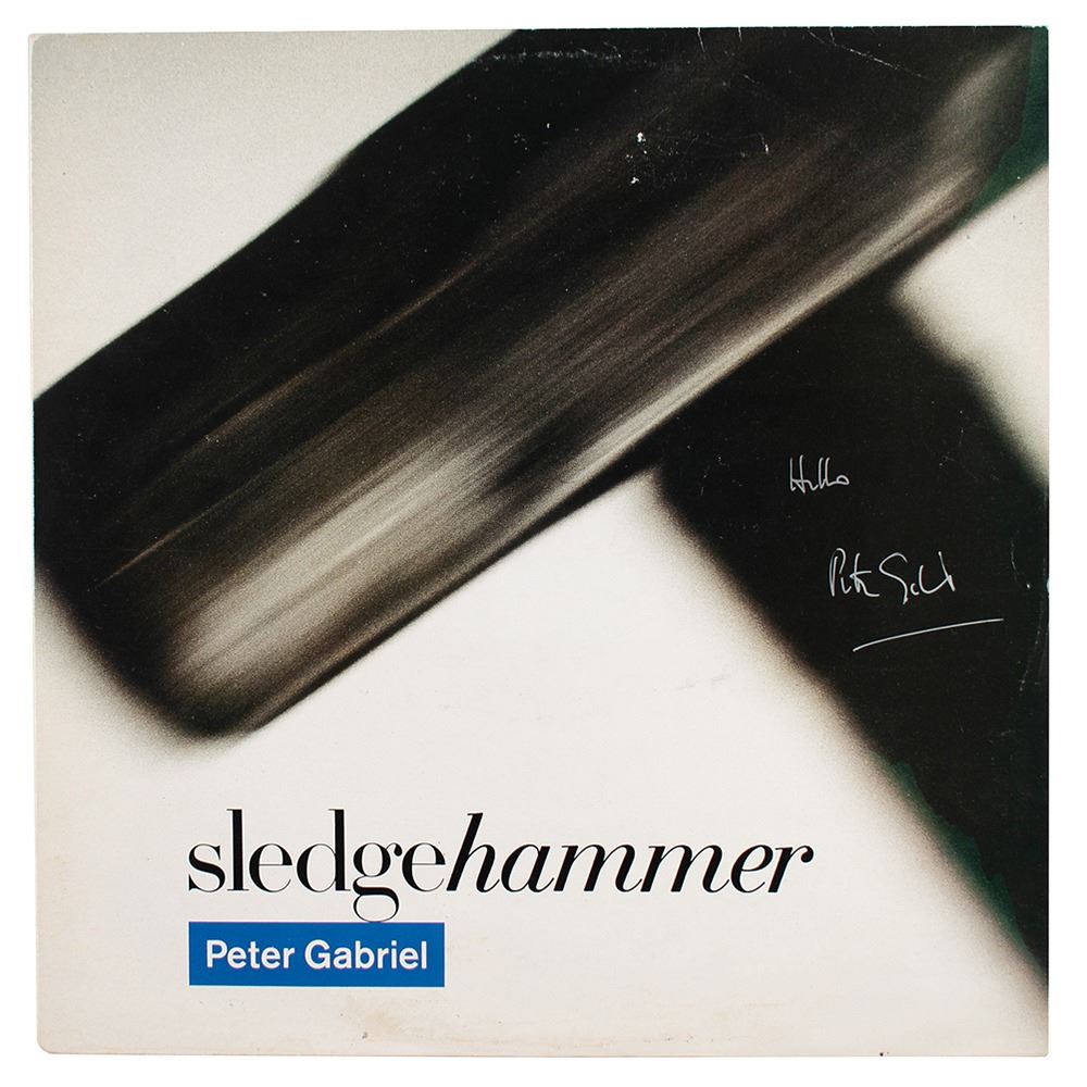 12-inch single album for 'Sledgehammer' by Peter Gabriel, who has signed the front cover in silver ink, "Hello, Peter Gabriel." In very good to fine condition, with edge and corner creasing, and an area of small gouges to the hammer illustration. The record is not included.