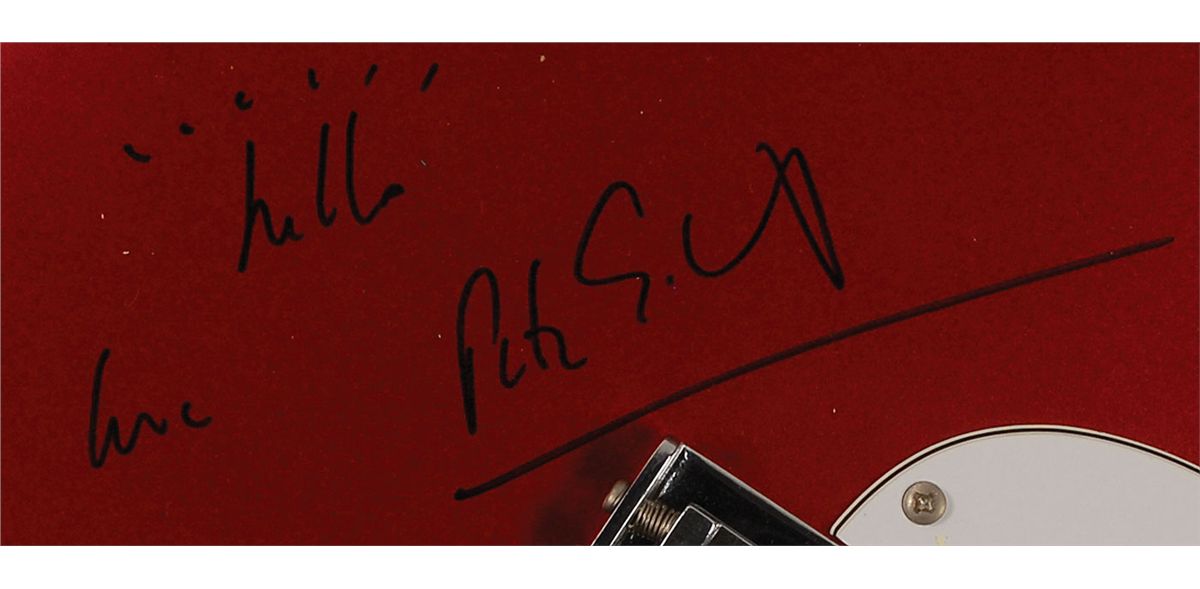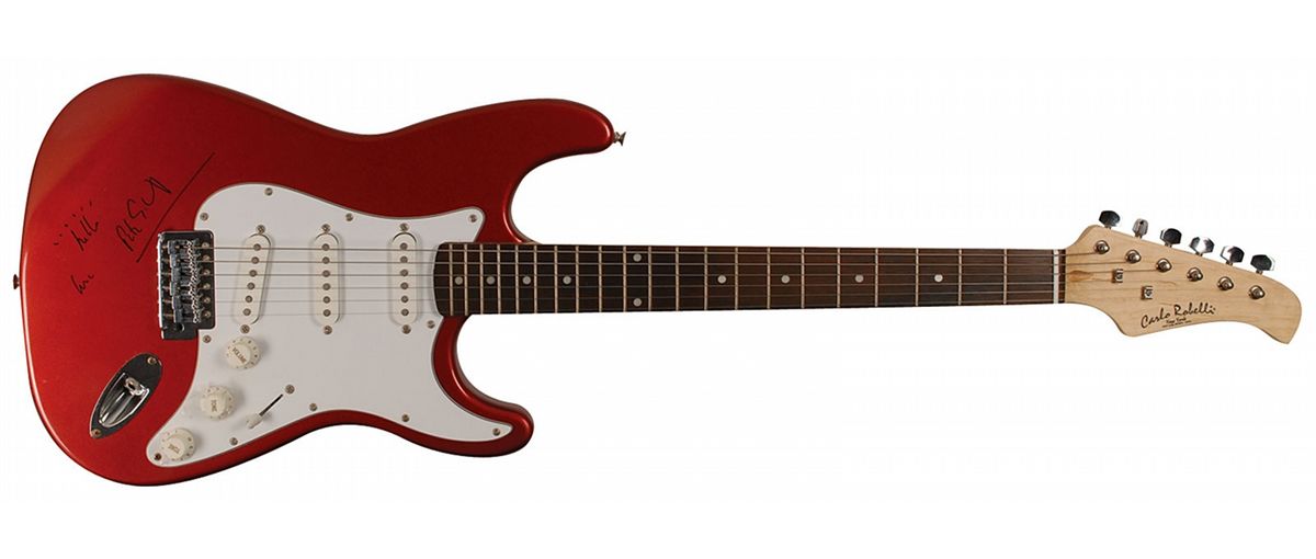 Red-bodied Carlo Robelli ‘stratocaster-style’ electric guitar, signed in-person on the body in black felt tip, “Hello, love, Peter Gabriel.” In fine condition. Originally obtained by in-person specialist Mike Wehrmann.
