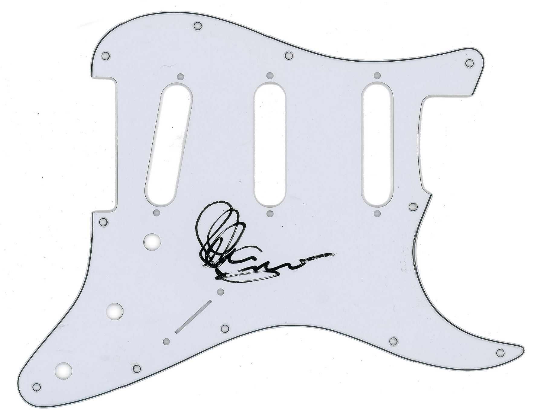 White Stratocaster-style pickguard signed in black felt tip by Peter Green. In fine condition. Accompanied by an unsigned poster promoting a Peter Green concert at the Cabooze in Minneapolis on May 5, 2002.