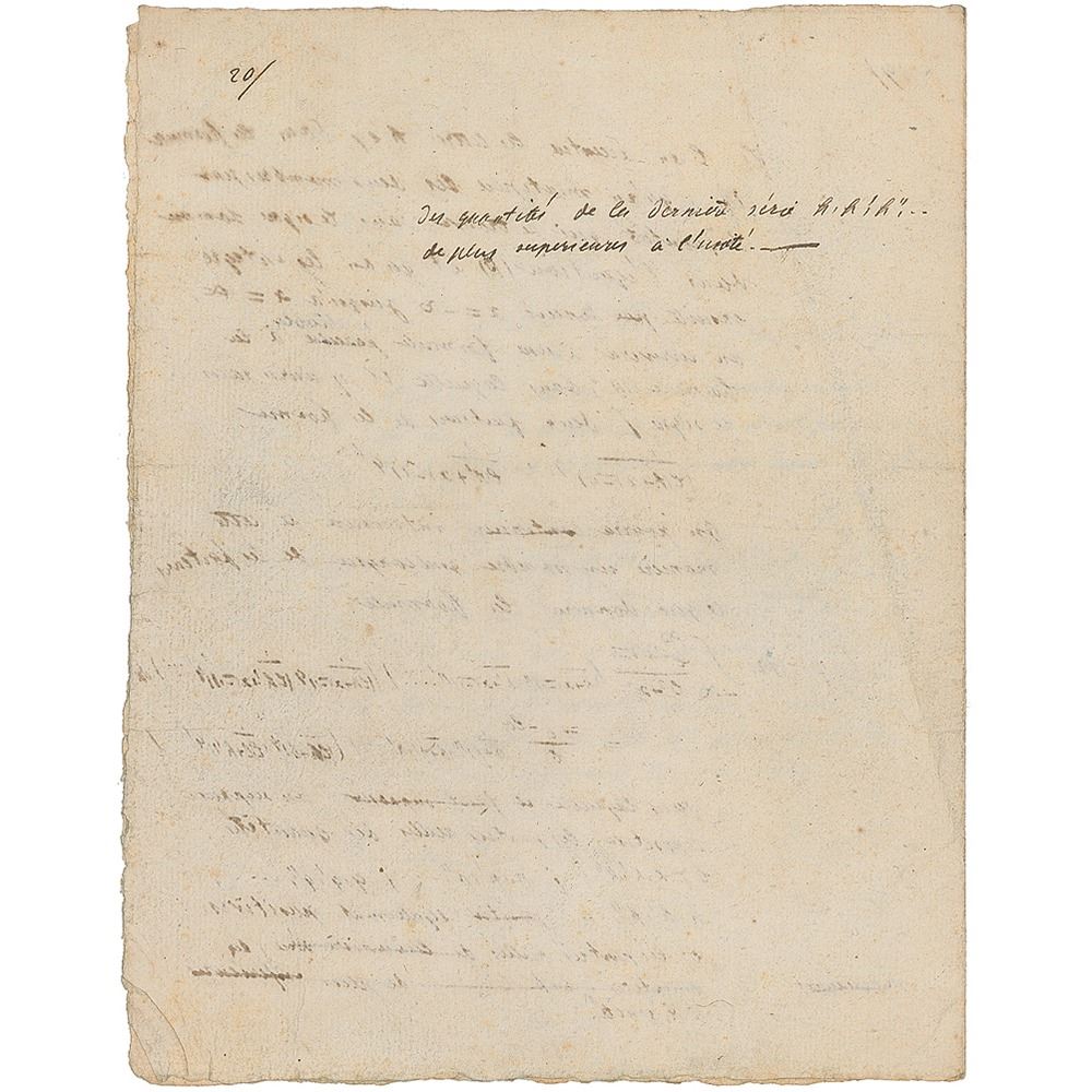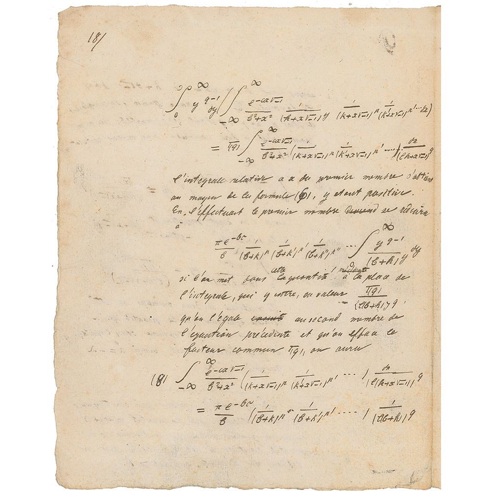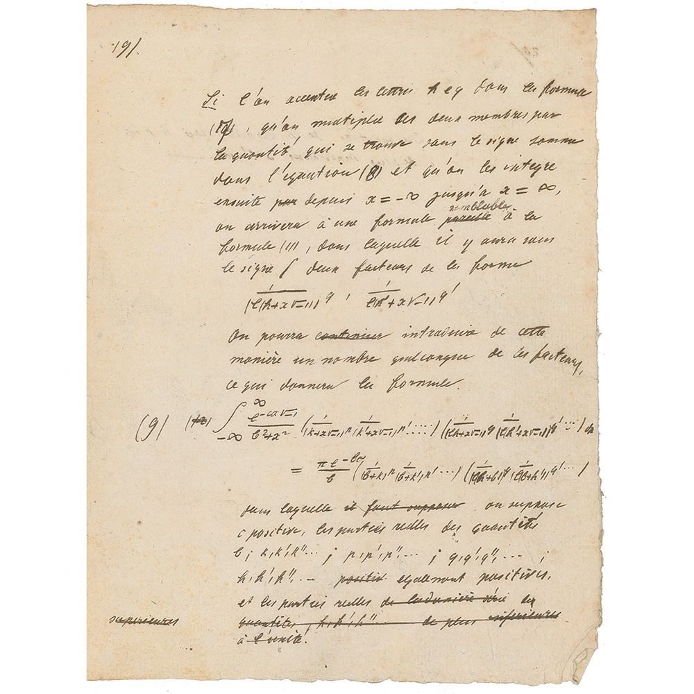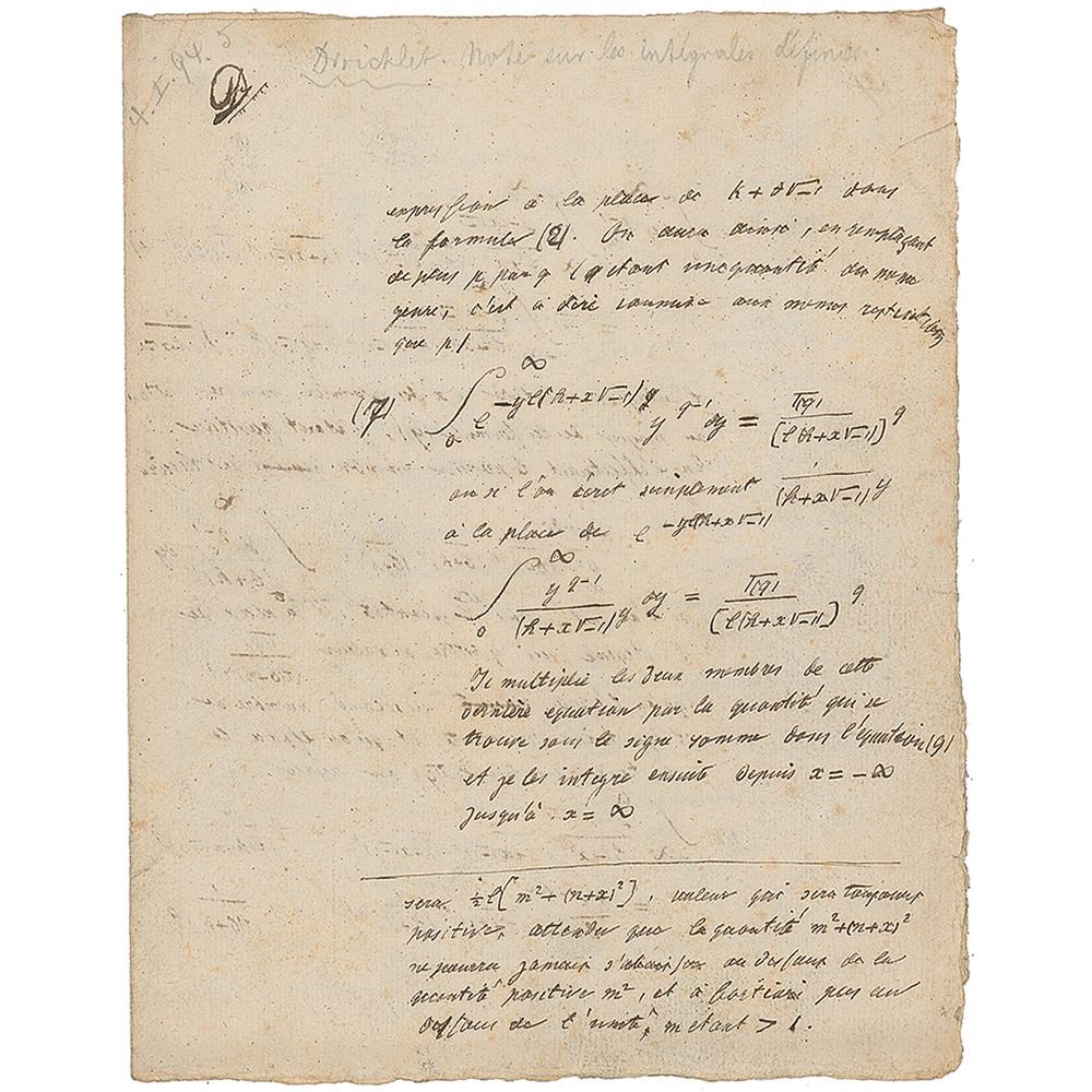 Exceptionally rare handwritten working mathematical manuscript in French by Peter Gustav Lejeune Dirichlet, four pages on two adjoining sheets, 7 x 9, being the last four pages of Dirichlet's 'Note sur les integrales definies [Note on Definite Integrals],' published in Crelle's Journal (Journal für die reine und angewandte Mathematik) in 1829. Throughout the text, Dirichlet pens several integral equations as he extends and simplifies the methods introduced by Poisson and Laplace. Through a series of straightforward manipulations, Dirichlet arrives at a formula here denoted as "(9)." Giving specific values the constants in his formula allowed Dirichlet to obtain in just a few pages what had taken his predecessors great lengths. In fine condition, with light creasing and faint foxing.