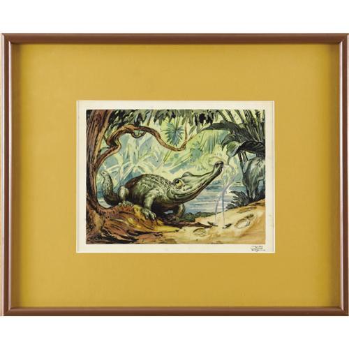 <B>Peter Hall - Peter Pan Unused Production Drawing Animation Art (Walt Disney, 1939).</B></I> Walt Disney's master concept artist, David Hall, painted this colorful swamp scene portraying a crocodile sniffing two smoldering cigars tossed aside by the evil Captain Hook. The concept was eventually dropped when Disney eventually released the film in 1953, fourteen years after the original planning stages resulted in this watercolor and dry-brush mixed-media rendering on 10.5" x 8" illustration board. It was eventually reprinted in <B>Uncle Scrooge</B></I> #316, as part of a feature titled "The Year That Was 1939, David Hall Revisited." The art has been professionally matted and framed to an overall size of 21" x 17", and is in Excellent condition. <I>From the Estate of Bruce Hamilton.</B></I> <BR><BR><B>Important notice:</B> Heritage usually auctions material at the rate of 200-250 lots per hour. On some occasions eBay Live bid software or the Internet may not be able to keep up with the pace of the auction. We recommend placing a realistic absentee bid now as insurance to avoid disappointment. Occasionally the auctioneer may eliminate or reject an eBay Live bid, and the auctioneer may also reopen a lot after the close of the eBay live bidding (usually because we missed an audience bid), and may reject your bid even if it shows you as the winning bidder. By bidding via eBay Live, you agree that Heritage may award the lot to another bidder at its sole discretion under the circumstances described above or any other reasonable circumstances. Since eBay bids are not shown to us until we open the lot on the floor, we treat those bids just like floor bids. In most cases the floor responds before the eBay bid is presented to us, due to Internet lag time, so for consistency we have made it a policy that floor bids are always considered first over tie eBay live bids. Also please note that all Heritage lots purchased through eBay Live carry a 22.5% Buyer's Premium. Please make sure you read the Terms and Conditions before you bid. This lot is being auctioned in conjunction with a live floor auction by Heritage Auction Galleries. All final auction and invoice information will be supplied by Heritage Auction Galleries, and all other information should be considered preliminary. Lot:41001 <BR><BR><B>Winning Notification and Billing:</B> After the FINAL session in this auction is complete, Heritage will send e-mail and snail mail invoices. This process normally takes several days. All final auction and invoice information will be supplied by Heritage Auction Galleries, and all other information should be considered preliminary. <BR><BR>This auction will be conducted on a live auction floor and over the Internet through eBay Live. If you choose to place an absentee bid, please take a moment to <font color='#0000ff'><u><a href='http://pages.ebay.com/liveauctions/help/before/laabsentee.html'>learn how eBay Live absentee bidding works</a></u></font><font color='#000000'>