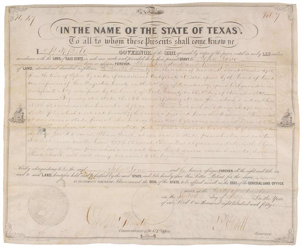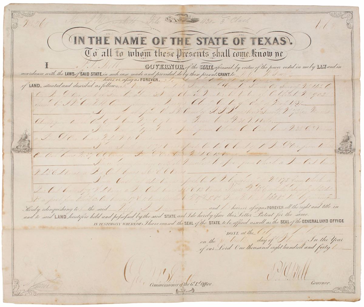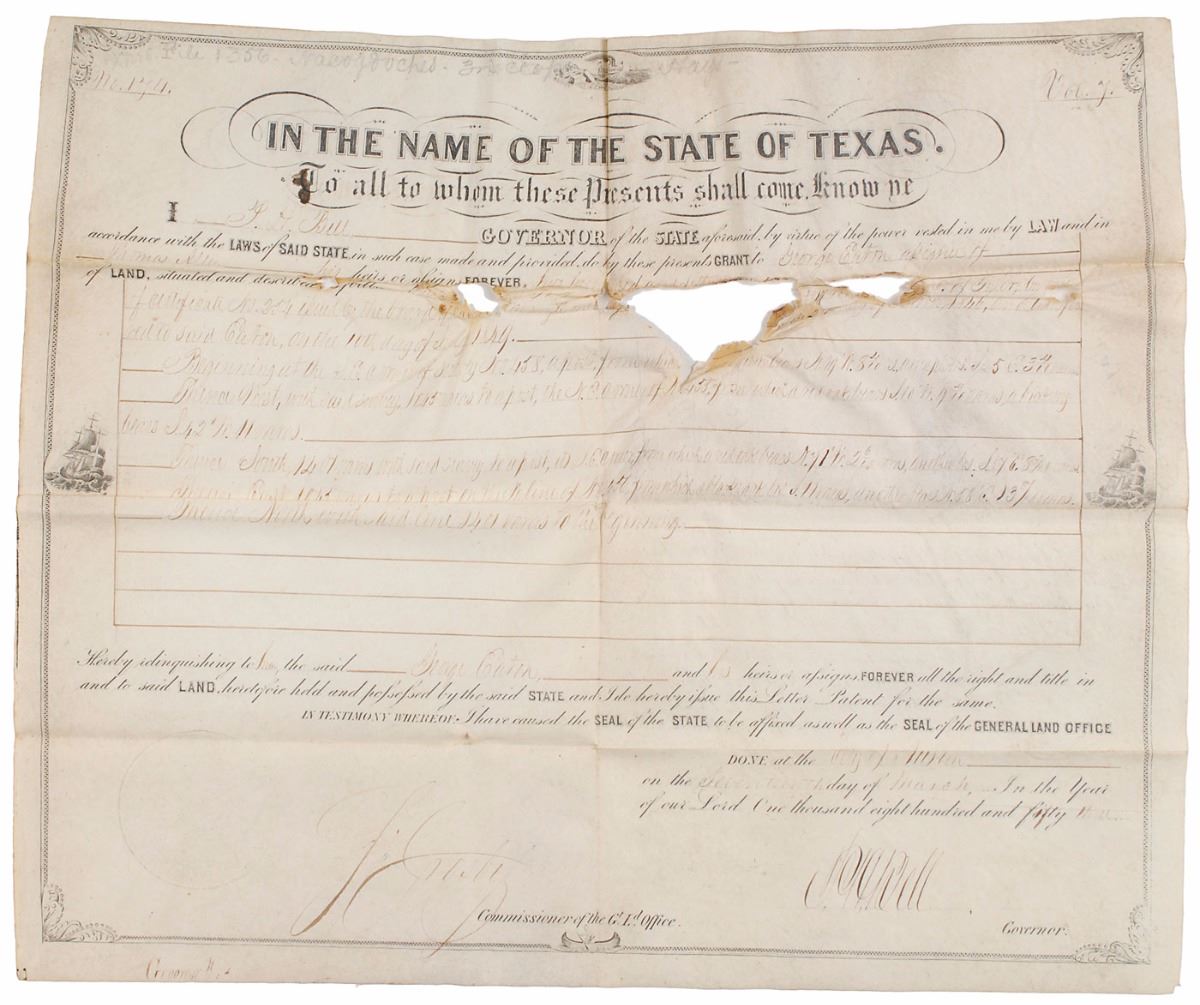 American military officer who served as a captain of the Texas Rangers under Sam Houston during the Mexican-American War and went on to serve as the third governor of Texas (1810–1898). Three partly-printed vellum DSs as governor of Texas, each signed “P. H. Bell,” one page, 15 x 12, dated from 1851 to 1853. Collection of three different land grants, each signed at the conclusion by Governor Bell, with two countersigned by George W. Smyth and the other countersigned by Stephen Crosby. In overall very good condition, with expected document wear, soiling, and large areas of paper loss to the 1853 document. Smyth, the commissioner of the Texas General Land Office who countersigned two of these documents, is also notable as one of sixty signers of the Texas Declaration of Independence.