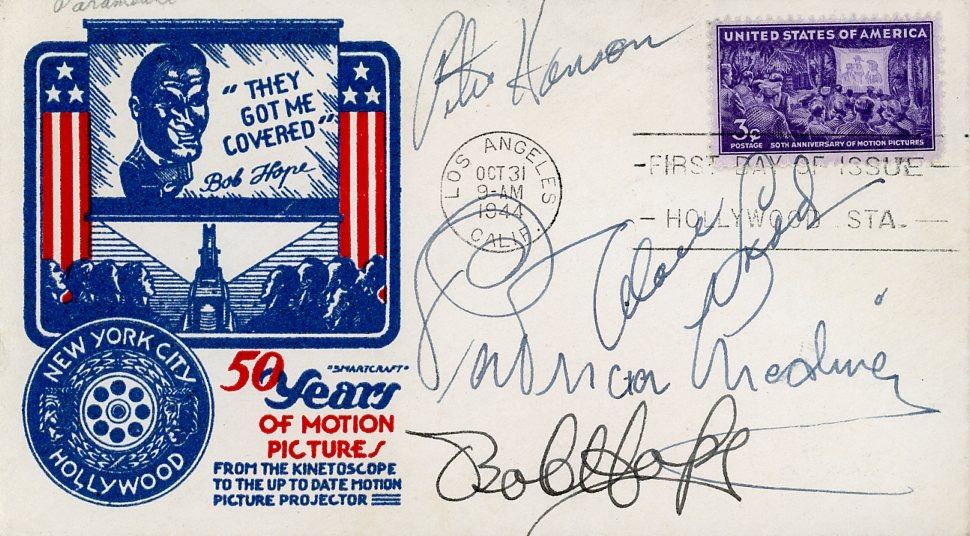 First Day Cover signed by Peter Hanson, Alan Ladd, Patricia Medina, and Bob Hope dated October 31, 1944. All items come with a COA and guarantee for the life of the piece.