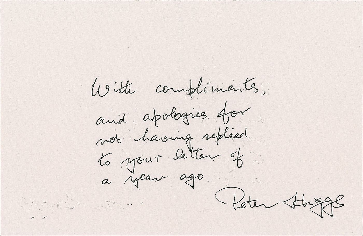 Theoretical physicist (born 1929) who earned a Nobel Prize for his work on the mass of subatomic particles; he famously predicted the existence of a new particle, the Higgs boson. ANS, one page, 7 x 4.5, no date. In full: "With compliments, and apologies for not having replied to your letter of a year ago." In fine condition, with a central vertical fold. Accompanied by the original mailing envelope.