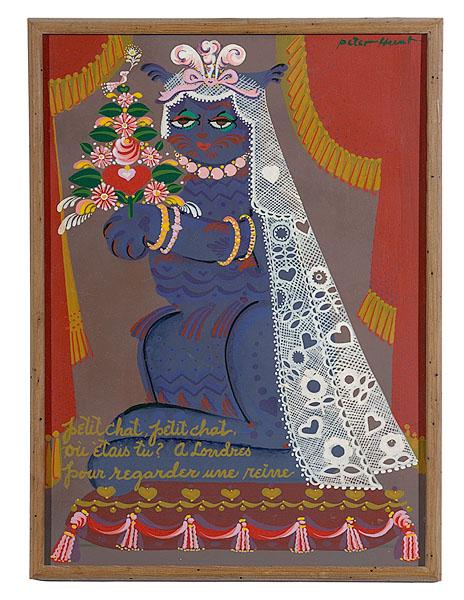 Cape Cod, Massachusetts, mid 20th century, oil on canvas, signed upper right. A Peter Hunt folky painting of cat wearing veil and jewelry; caption below in French is a Nursery Rhyme. In a wood frame; 29" high x 21" wide.