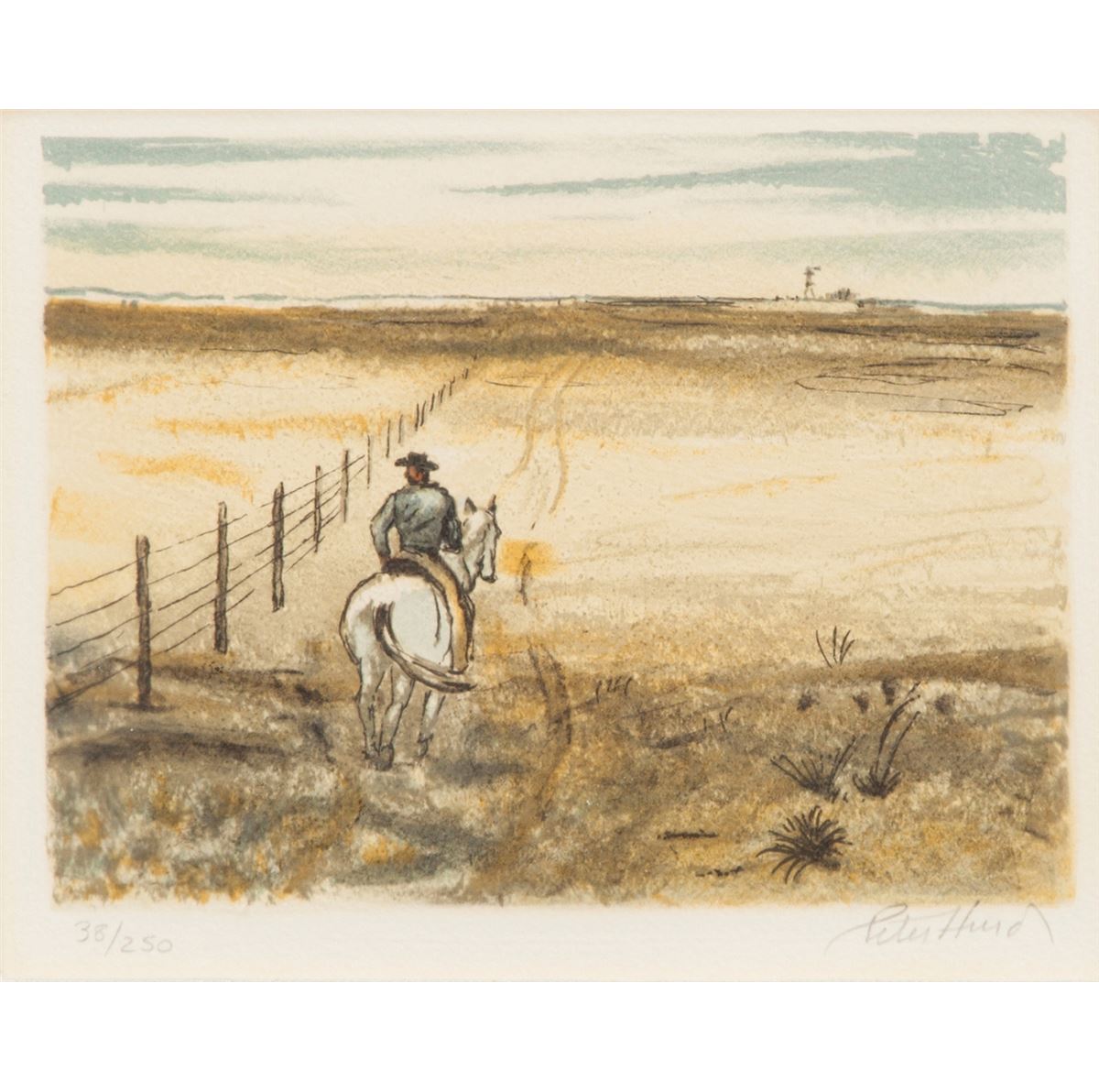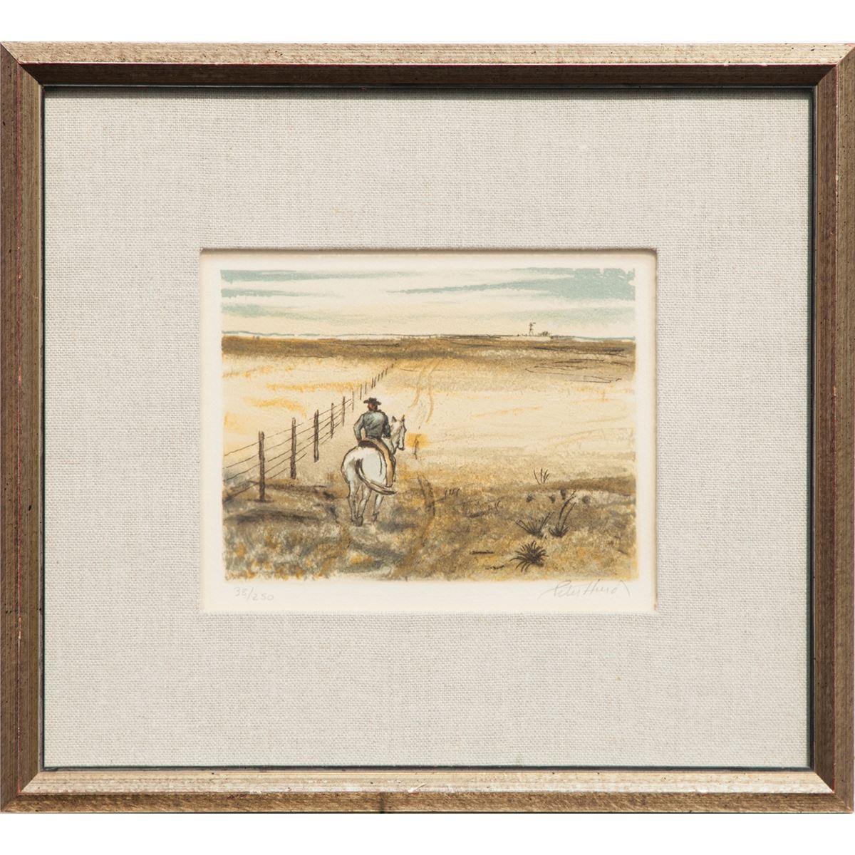 Peter Hurd (1904-1984). Fence Rider. 5 ½" x 7 ¼" lithograph. Pencil signed in lower margin: 38/250 Peter Hurd. Framed under glass to 13 ¾" x 15 ½".