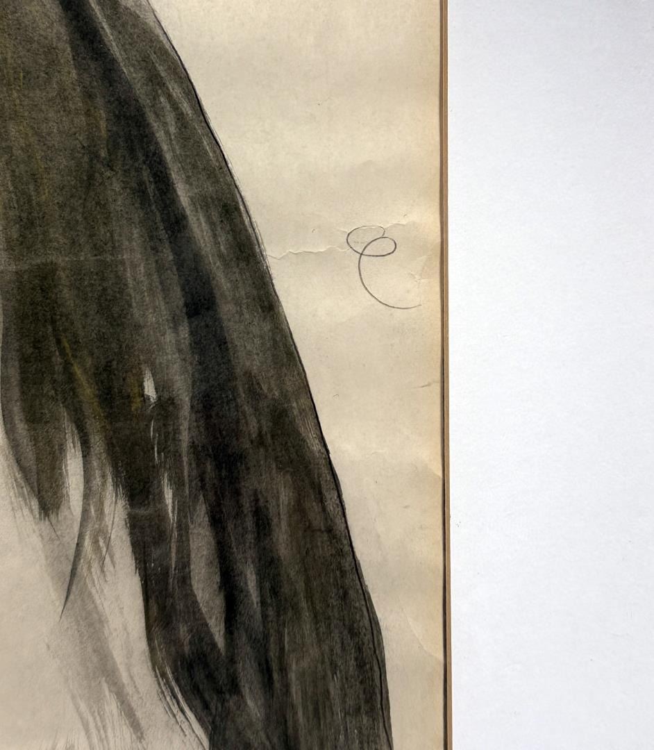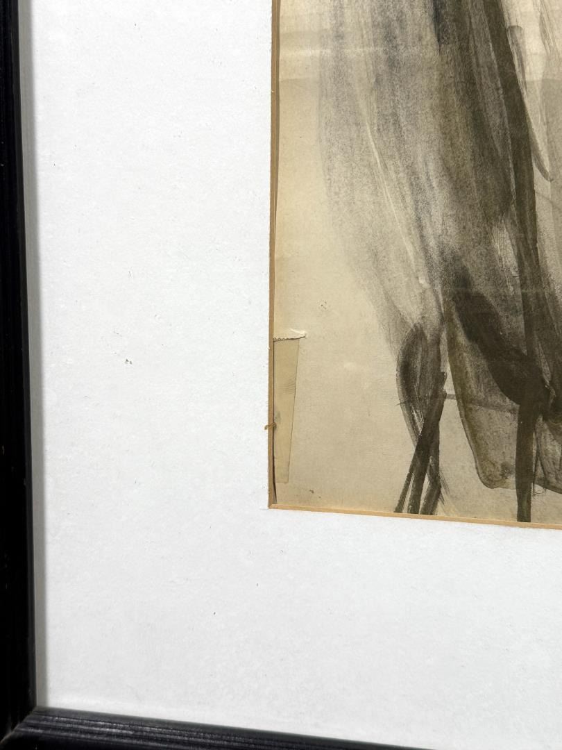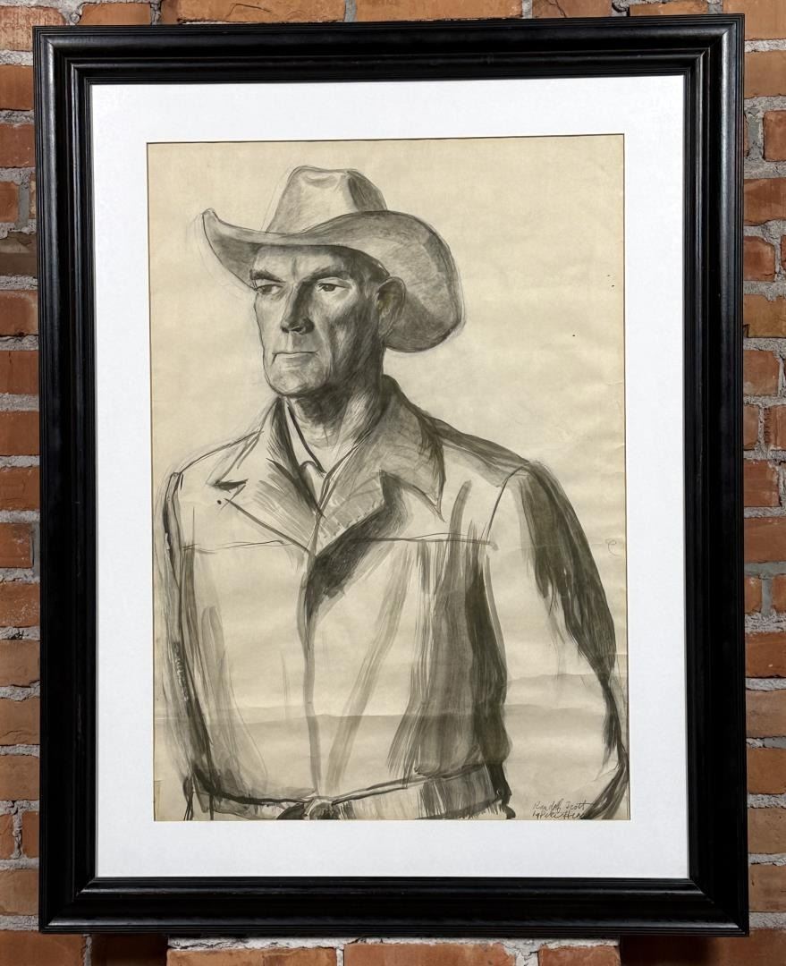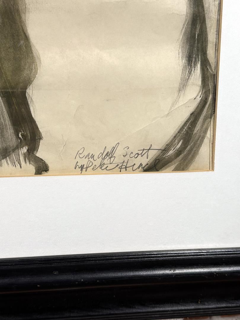 Title is Western Movie Star George Randolph Scott. 23" by 33" unframed. 34" by 43 1/2" framed. Watercolor on Paper. George Randolph Scott (January 23, 1898 – March 2, 1987) was an American film actor, whose Hollywood career spanned from 1928 to 1962. As a leading man for all but the first three years of his cinematic career, Scott appeared in dramas, comedies, musicals, adventures, war, horror and fantasy films, and Westerns. Out of his more than 100 film appearances, more than 60 of them were Westerns. Peter Hurd (1904 - 1984) was active/lived in New Mexico, Pennsylvania. Peter Hurd is known for Western landscape, genre and portrait painting, etching. A regionalist painter known for his landscape, figure and genre paintings of New Mexico, Peter Hurd was especially focused on capturing light and atmosphere. His preferred medium was tempera on gesso panel, and many of his works depict the panoramic views he saw from his beloved ranch land as well as the people with whom he was most familiar---Indians, Mexicans, and Caucasians. He was also a muralist and did many lithographs and watercolors. Hurd was born in Roswell, New Mexico on February 22, 1904 as Harold Hurd, Jr. Called Pete from his early days on, he legally changed his name to Peter in his early twenties. In 1921, he enrolled as a student at West Point Military Academy in New York state. Selling a painting to a supervisor, he felt encouraged to become an artist instead of a military career man. In 1924, he enrolled in the Pennsylvania Academy of the Fine Arts and also took private lessons from well-known illustrator N.C. Wyeth. In 1929, he began to work in tempera on gesso-prepared panels, which became the medium he most frequently used. He married Wyeth's oldest daughter, Henriette, in 1929, and took his bride to New Mexico, the place of his birth, for an extended honeymoon. They later established their home in the southern part of the state in San Patricio, and Henriette also became a prominent artist. In the mid-1930s, he was a mural painter, completing post-office murals in Big Springs and Dallas, Texas, and in Alamogordo, New Mexico. During World War II, he was a war correspondent and artist for Life magazine, a job in which he used his military background. His special assignment included a bomber base in Britain. In 1942, Peter Hurd was elected to full membership of the National Academy of Design