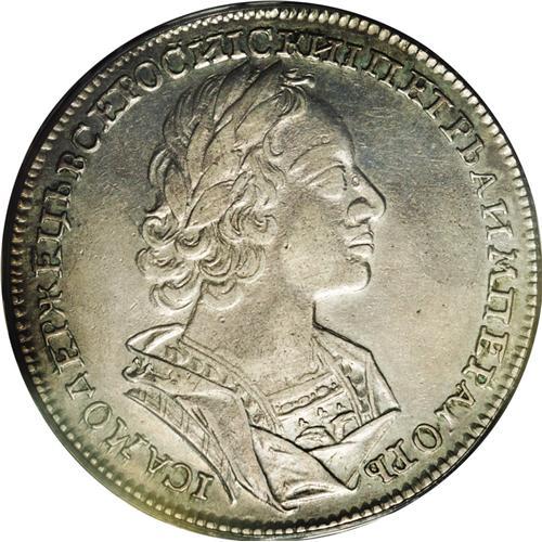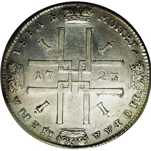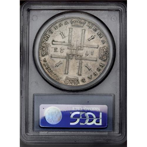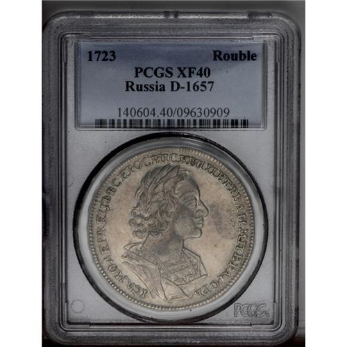 <B>Peter I. Rouble 1723,</B></I> Bit-904, Diakov-59, Uzd-610, XF40 PCGS. Well struck with the characteristic dot on Peter's forehead.