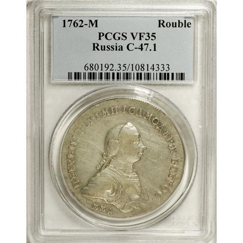 <B>Peter III. Rouble 1762 MM?-?M,</B></I> Bit-9, VF35 PCGS. Light gray patina with minor reverse flan flaws. A very nice piece for the grade.<BR><BR><b>Shipping:</b> Coin/Currency (<a target="_blank" href="http://www.heritageauctions.com/common/shipping.php">view shipping information</a>)