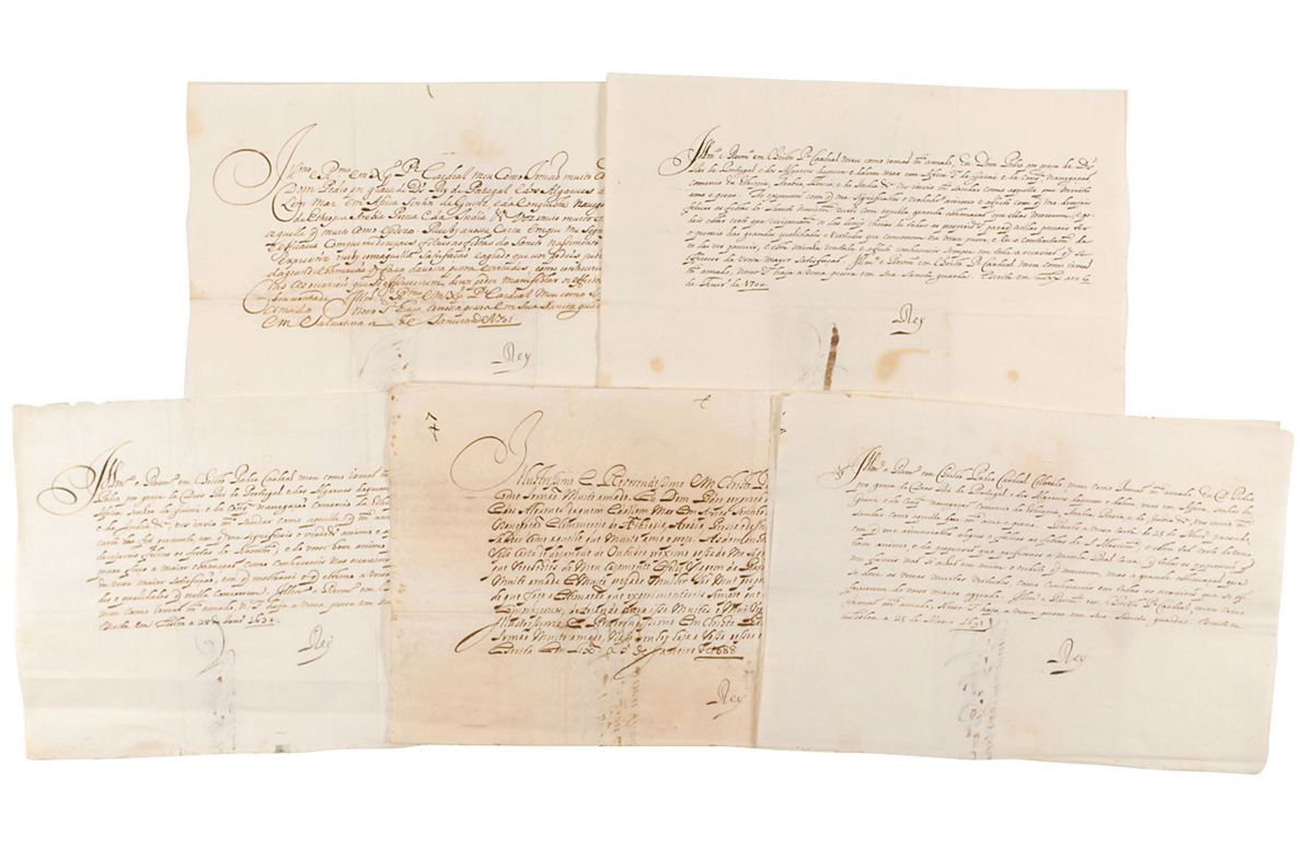 Youngest son (1648–1706) of John IV who became King of Portugal and the Algarves in 1683. Five LSs in Portuguese, signed “Rey,” each one page, approximately 12 x 8, dated between 1688 and 1701. Untranslated letters to Cardinal Colloredo. Four letters retain their original paper seals affixed to the second integral sheet (most sheets separated and reattached). Intersecting folds and some scattered staining, otherwise overall fine condition.