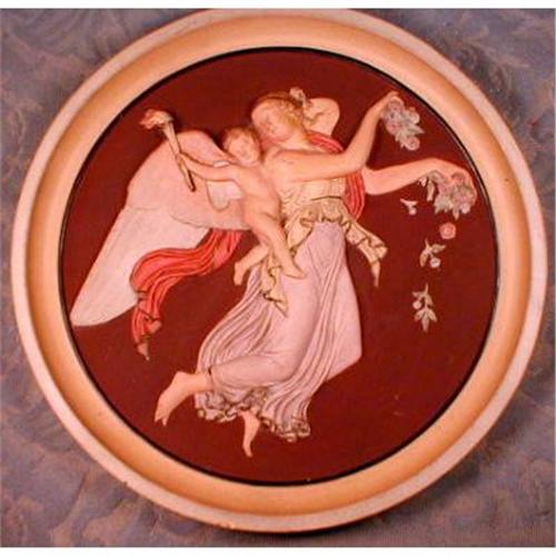 Beautiful plaque designed by Peter Ipsen either inspired by or in imitation of Roman archeology. Classical motif shows a female angel (or winged Victory) and a cherub in beautifully detailed relief. Painted ocher, deep red and other colors inspired by the frescoes at Pompeii.