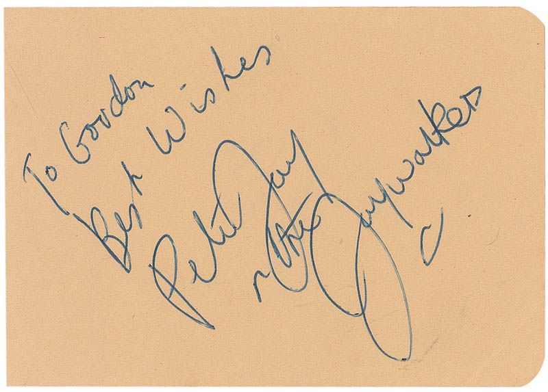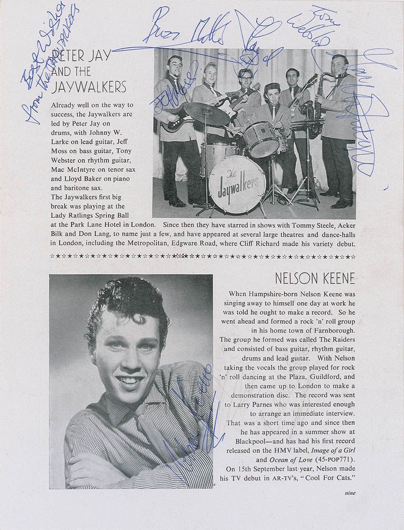 A vintage ballpoint signature and inscription, “To Gordon, Best wishes, Peter Jay & the Jaywalkers,” on a beige 4.25 x 3 album page; and a vintage 8 x 10.25 program photo, signed in blue ballpoint by the remainder of the band, with one adding an inscription to the top left corner. Page is also signed in blue ballpoint by Nelson Keene. In fine condition, with a couple creases to program page.