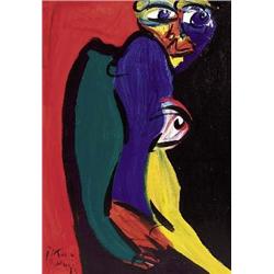 Peter Keil (German, 20th century), “Figure of a Woman”, c. 1983; oil/canvas, 39.5” x 27.5”, signed and dated; inscribed, “Berlin” verso. Keil is with Elvira Bach, Rainer Fetting, and Georg Baselitz in the Grossen Wilden of Berlin. He studied with Otto Nagel, Berlin Academy of Fine Art, and with Miro on Mallorca.