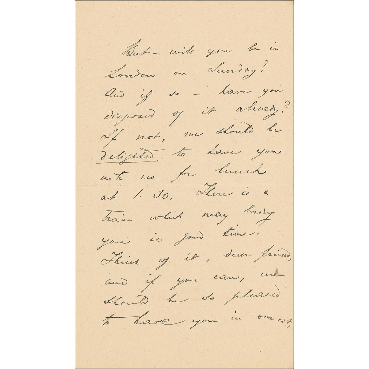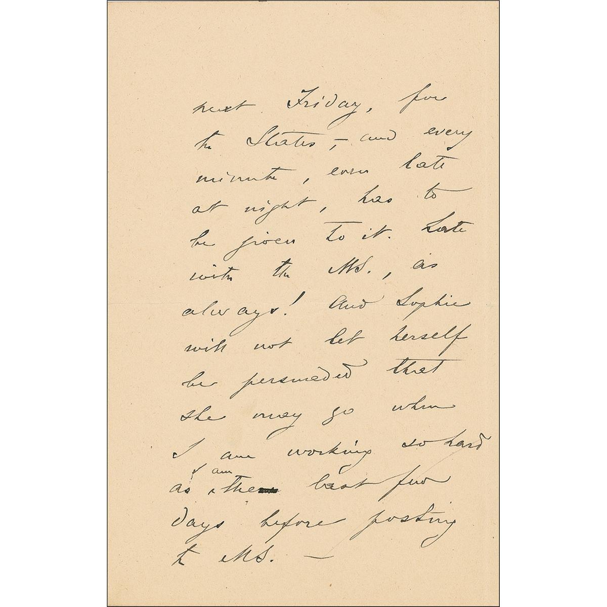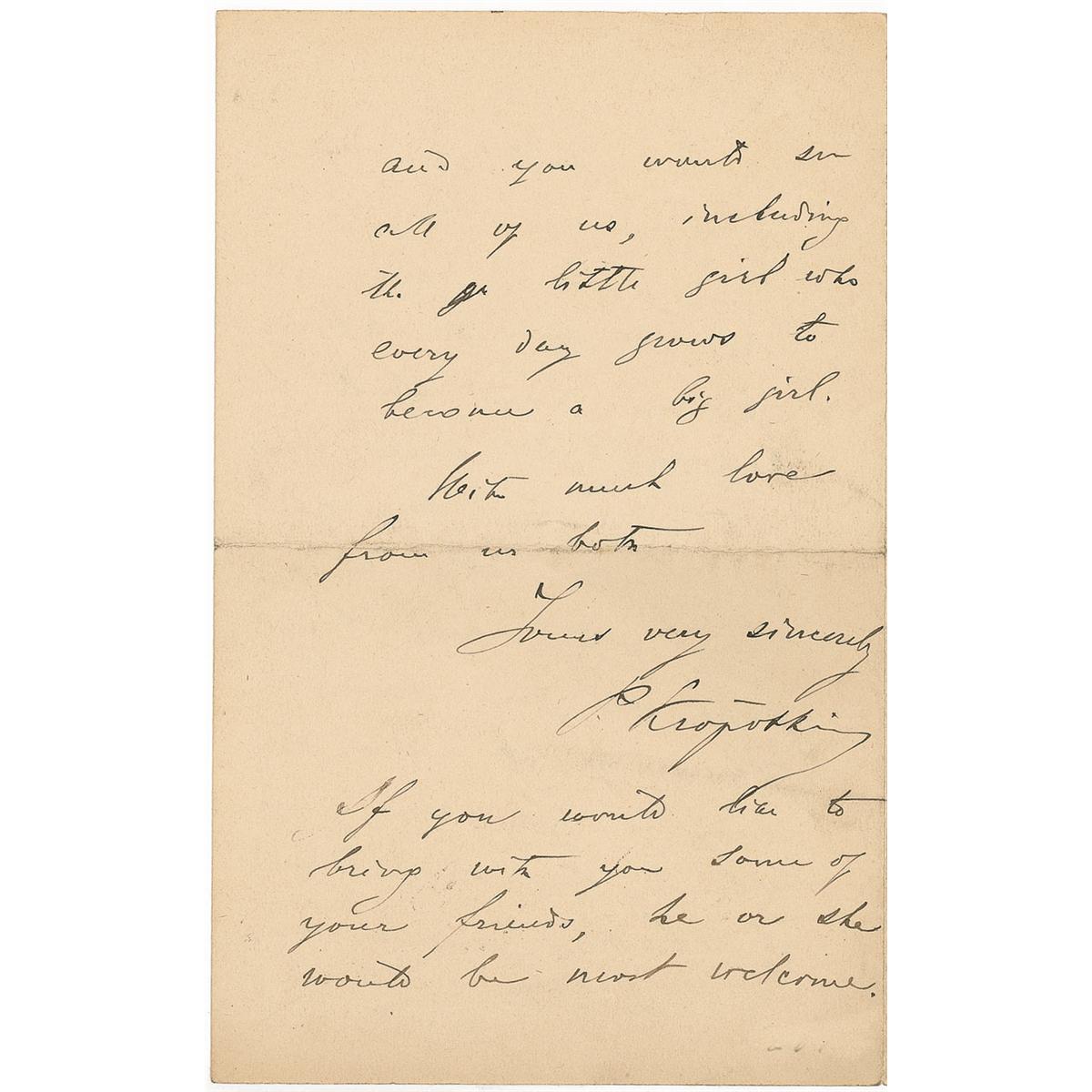 Russian prince and anarcho-communist (1842–1921). ALS signed “P. Kropotkin,” four pages on two adjoining sheets, 4.5 x 7.25, June 7, 1899. Kropotkin writes to a man named Rowley regarding a possible visit. In part: “We would be happy to spend a few hours in our company, but, alas, it is impossible. I am just finishing the next instalment [sic] of the Memoir which has to be posted next Friday, for the States, and every moment, even late at night, has to be given to it. Late with the MS., as always! And Sophie will not let herself be persuaded that she may go when I am working so hard as I am the last few days before posting the MS.” In fine condition.